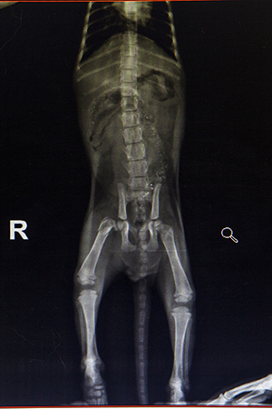 Cual ha sido nuestra sorpresa al llevarle al veterinario y ver que el pobre tiene el femúr roto, aún con los dolores que tiene que tener, de vez en cuando anda, aunque prefiere quedarse quieto en una camita, obviamente… la radiografia tambien nos dejo ver que tenia piedritas y porquerias que habia comido, suponemos que por falta de comida o por hambre.