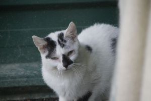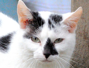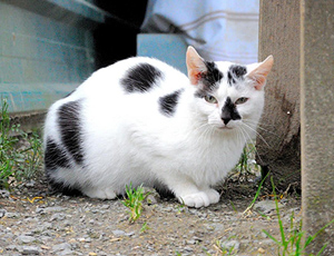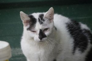 Durante algún tiempo ha sido dificil fotografiar a Alana; acostumbraba a estar escondida y no se dejaba ver. En los últimos meses, sin embargo, a su manera ha empezado a confiar. Espera a que nos alejemos un poco para comer su ración de lata, pero después se relaja y nos «tolera» en el recinto. Y nosotras contentas de que sea así porque es una gata guapisima, con unas manchas caprichosamente colocadas, a la que nos encanta ver.