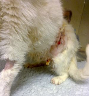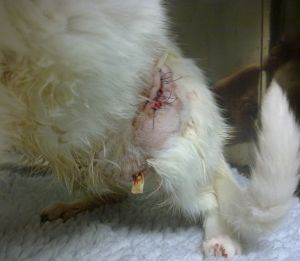 Lo que empezó siendo un punto suelto e infectado… se ha convertido en una tremenda infección que le ha cogido hasta parte de la pata. Ha habido que abrir de nuevo, limpiar el desastre interno que tenía y dejar con drenajes para que siga saliendo lo que hay dentro. Todo esto por culpa de una bacteria llamada pseudomonas que debe ser complicada de quitar.