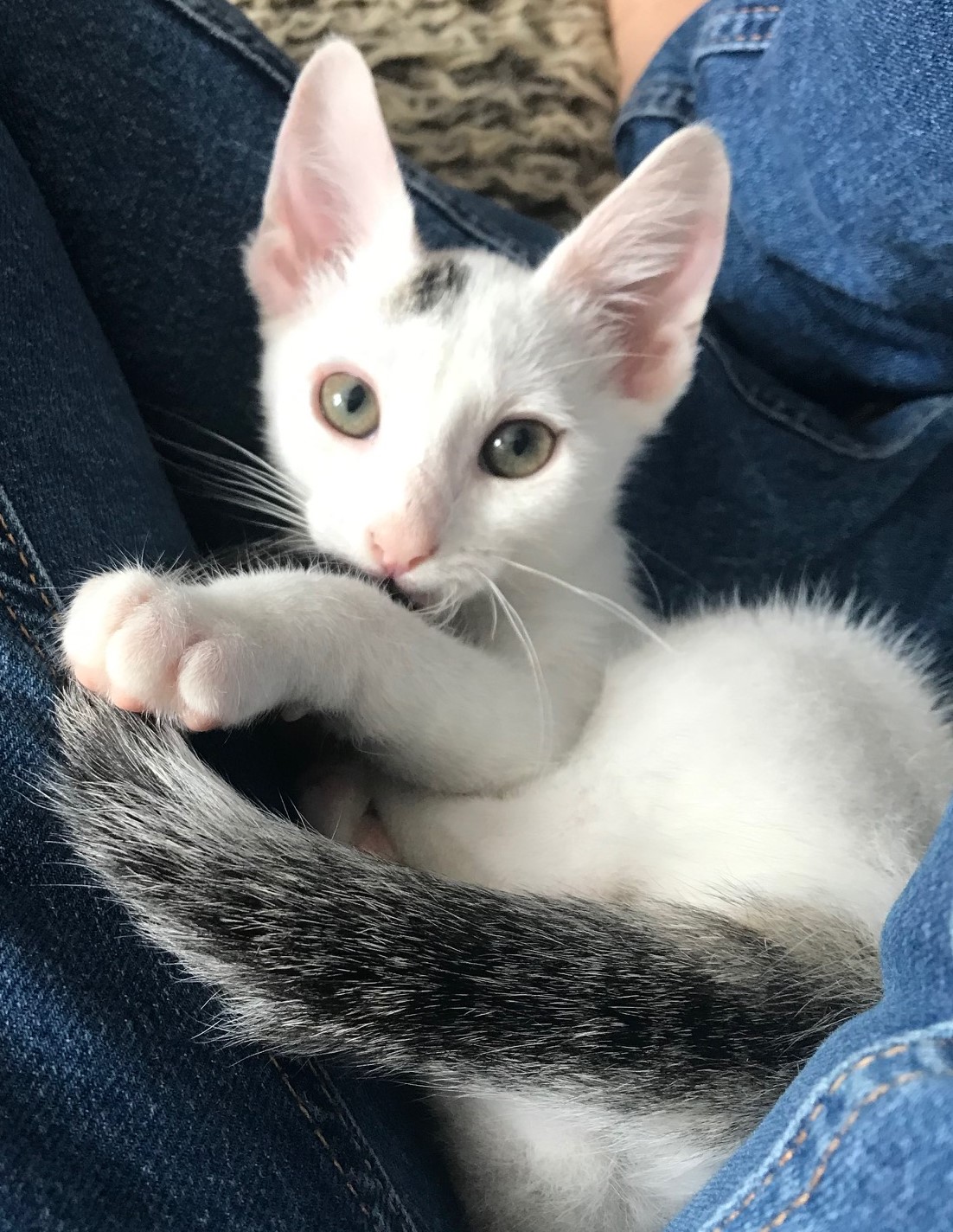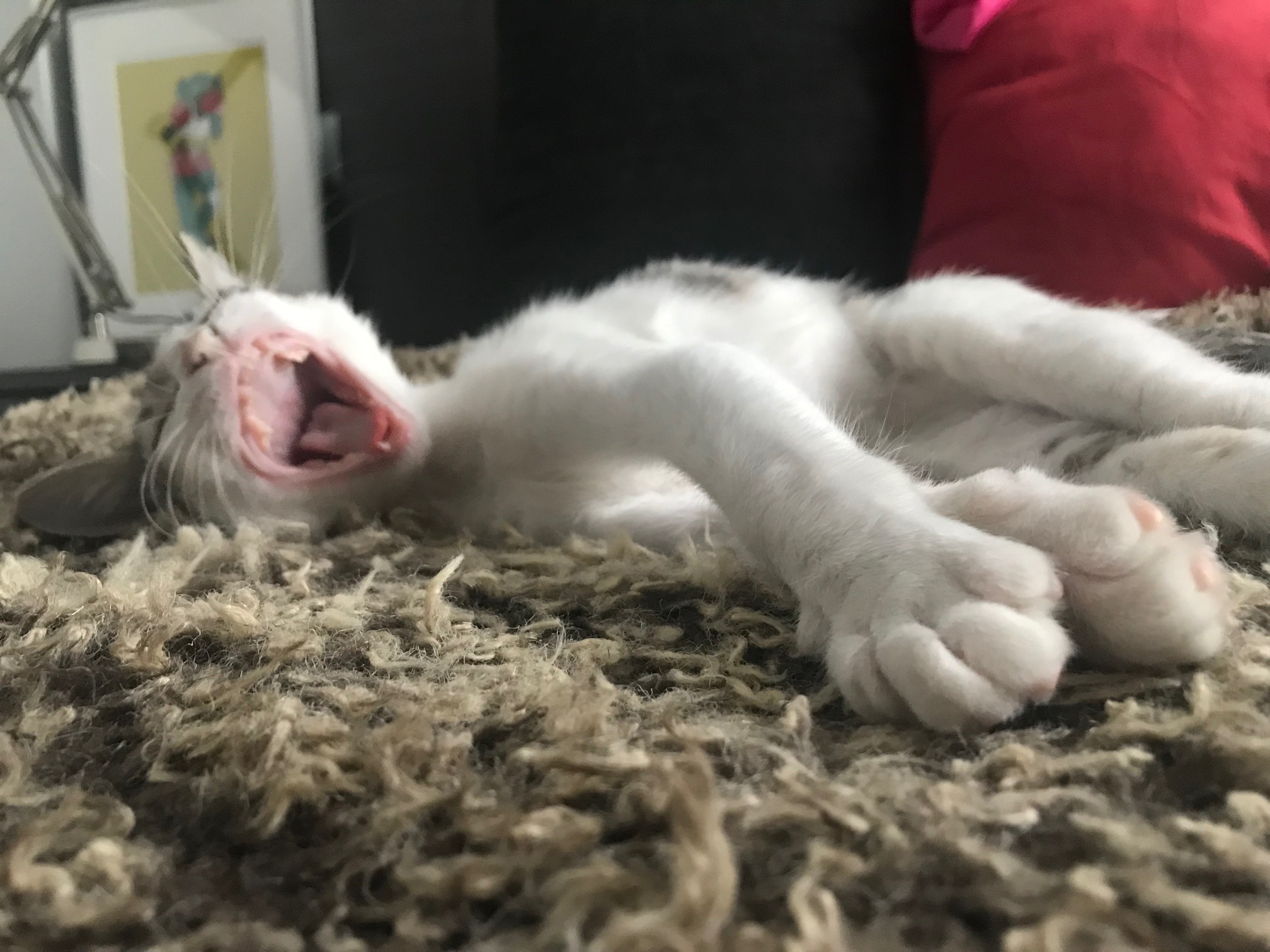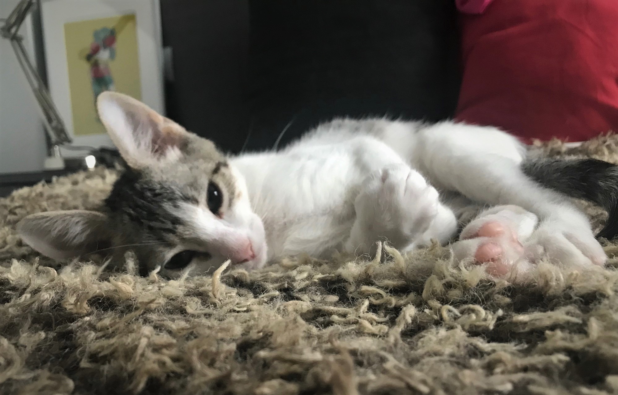 Alfa es muchísimo más cariñoso. Corre como un loco pero, cuando se cansa, va a buscarte para tumbarse a tu lado. En cuanto lo coges ronronea como un motorcito. Y te sigue por toda la casa como una ratita, necesita saber dónde estamos y qué estamos haciendo.