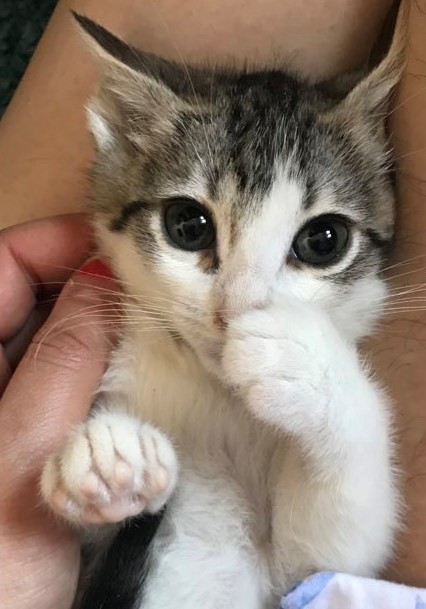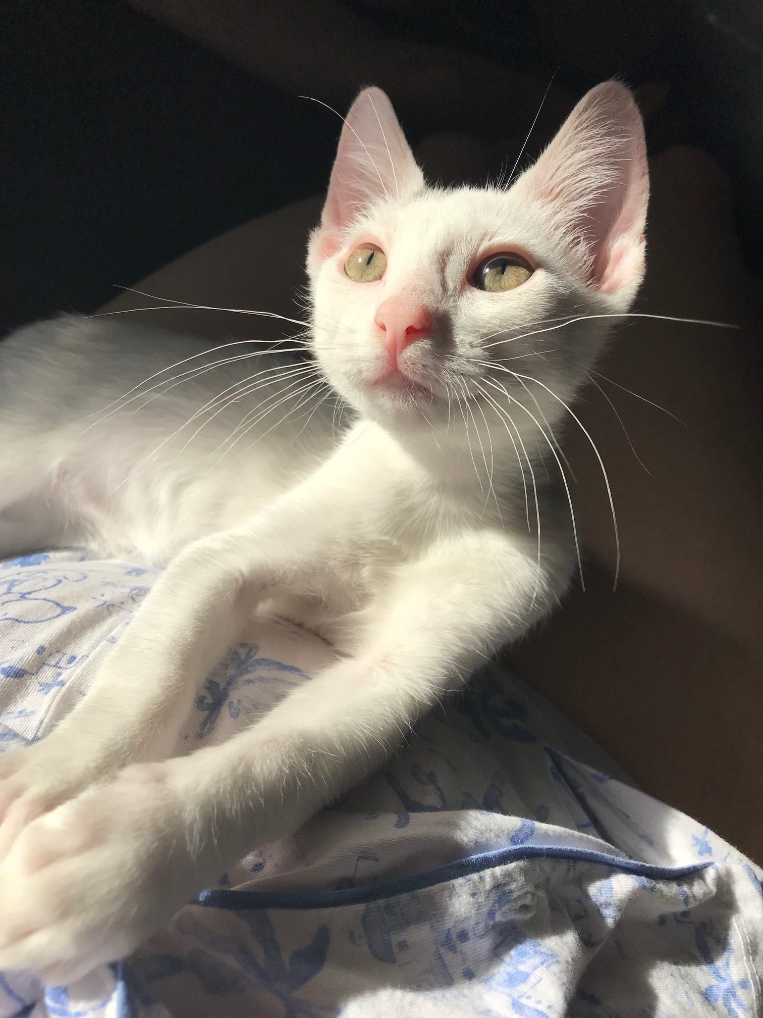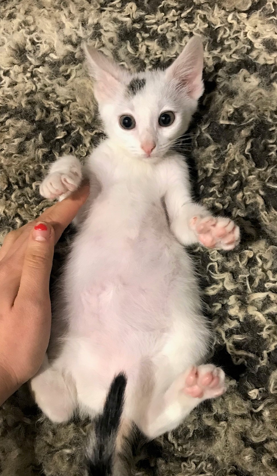 Alfa es muchísimo más cariñoso. Corre como un loco pero, cuando se cansa, va a buscarte para tumbarse a tu lado. En cuanto lo coges ronronea como un motorcito. Y te sigue por toda la casa como una ratita, necesita saber dónde estamos y qué estamos haciendo.