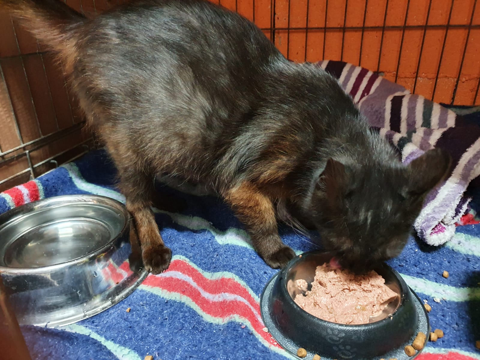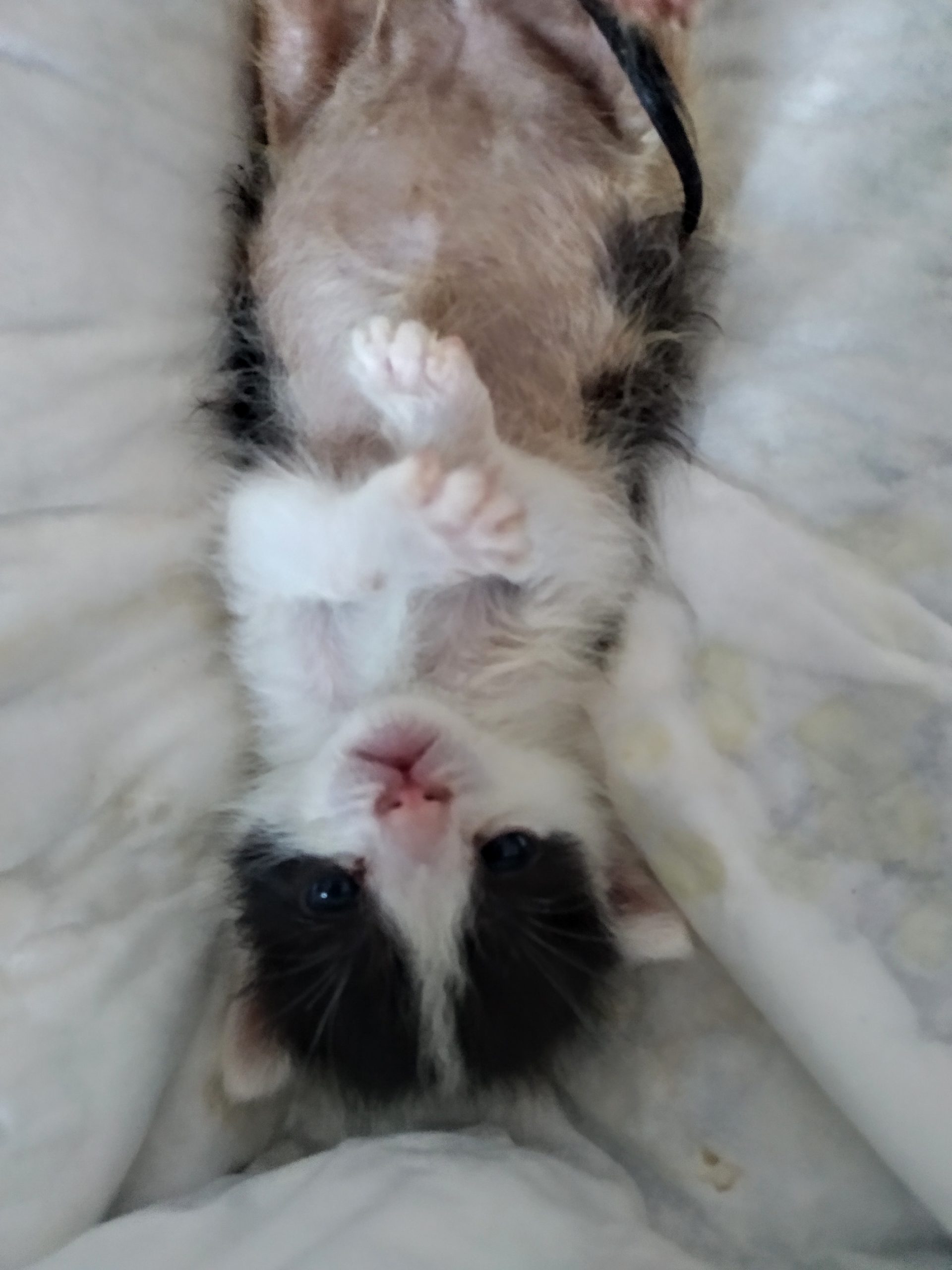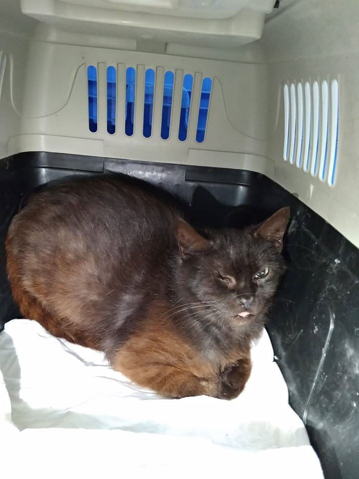 America fue recogida de la calle como un macho de cuatro meses pero nada mas llegar a nosotras entendimos que era una hembra preñada. No es para nada joven, creemos mas bien que es bastante adulta. La vida en la calle le ha dejado secuelas de herpesvirus y como veis tiene un ojo mal . Paso por el veterinario ya que presentaba cuadro respiratorio y se apreciaban 4 fetos.