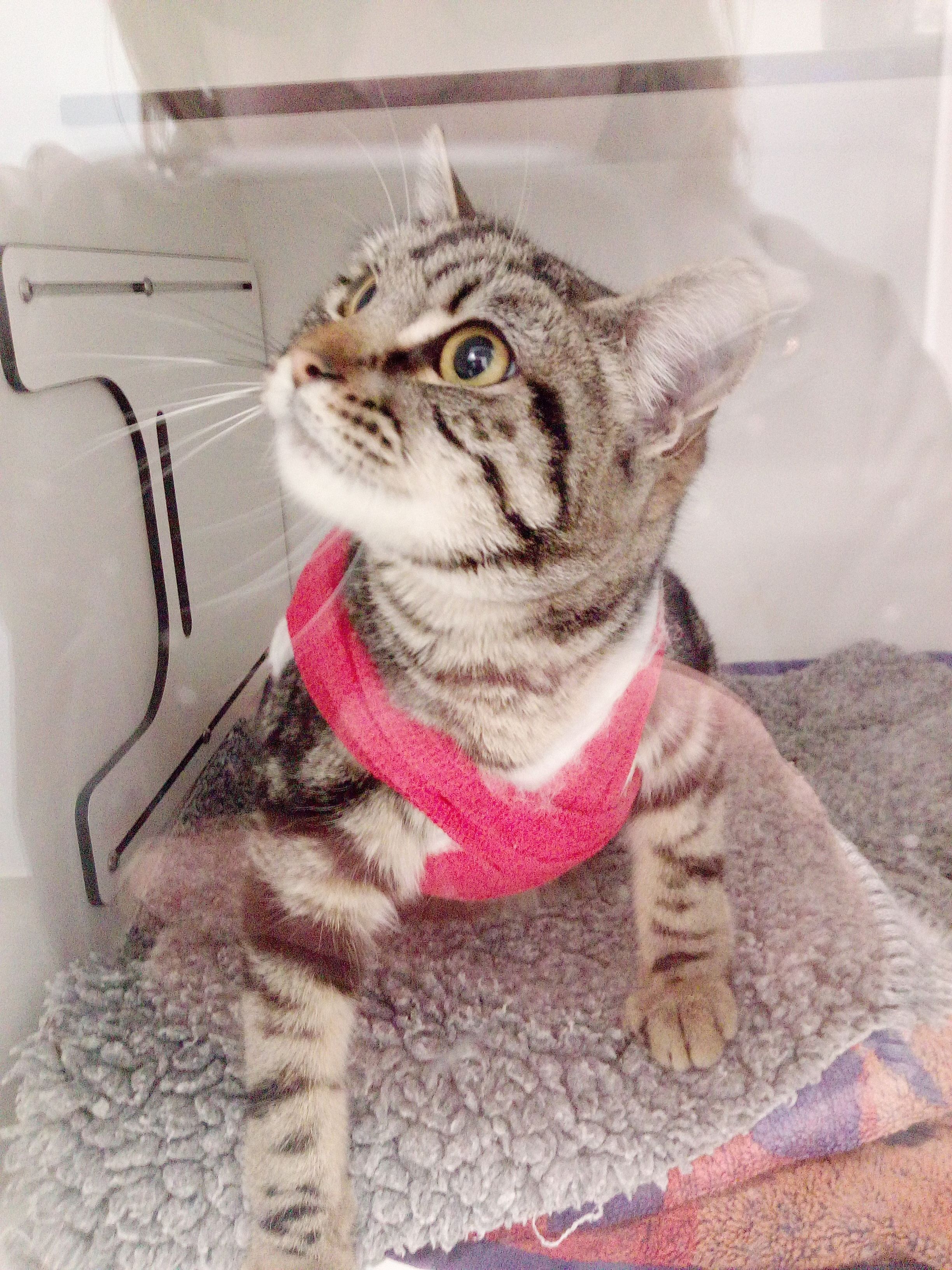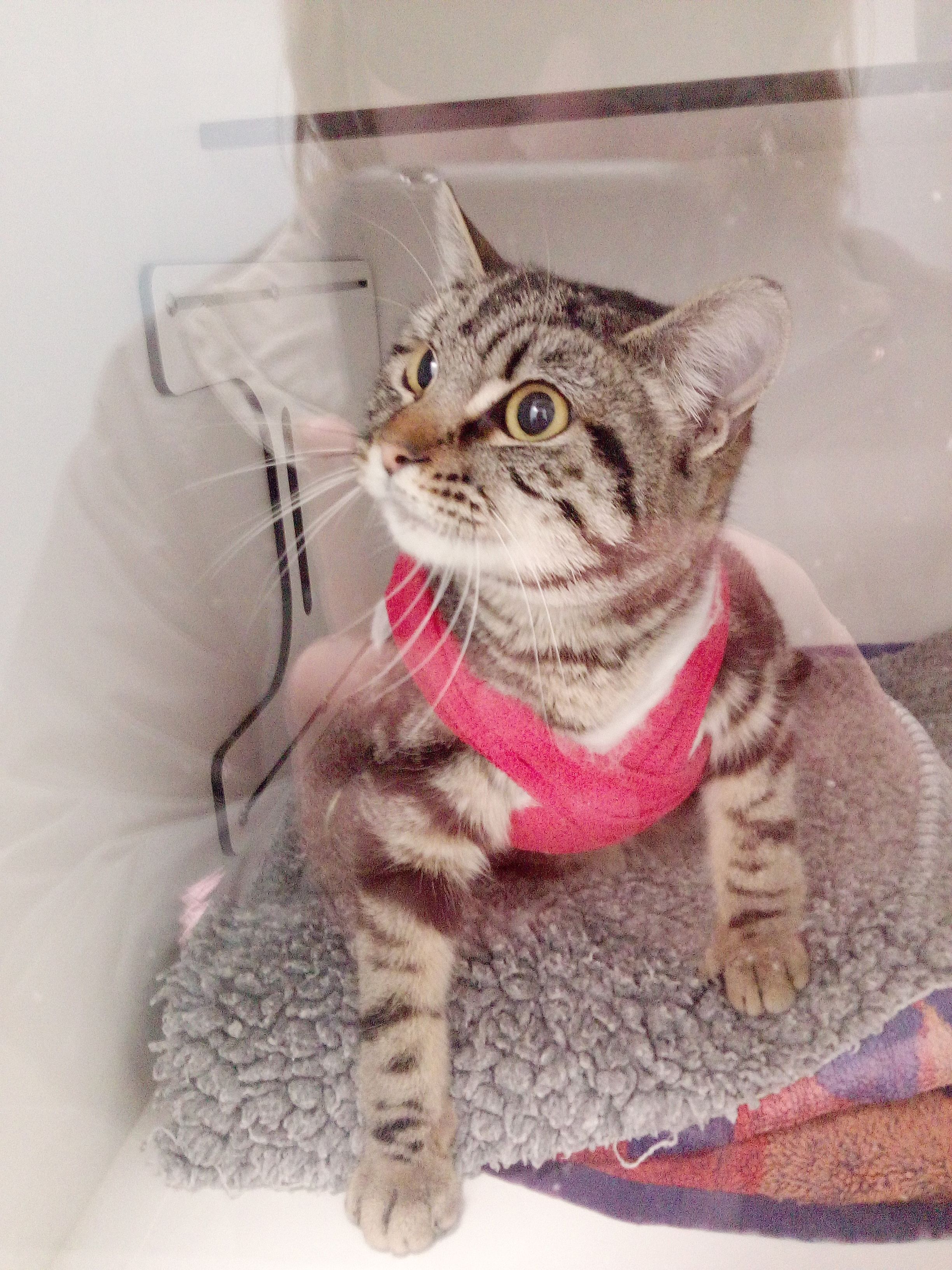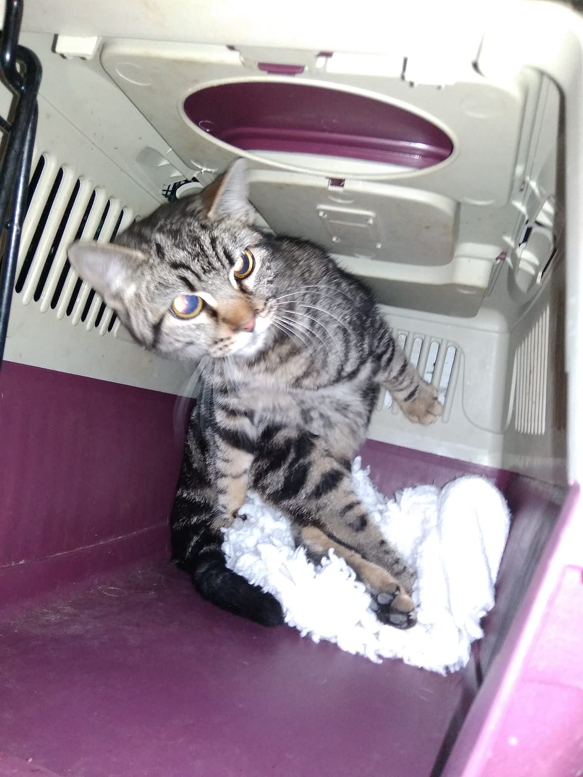 Hace tiempo que no contamos novedades sobre Ametsa. Desde que llego esta con tratamiento antibiótico, tuvo que pasar por una cirugía muy complicada para poder limpiar bien la infección que tenia en la vertebra y la impedía andar y desde entonces esta en reposo en una jaula. Contra todo pronostico Ametsa se ha ido recuperando y a día de hoy puede mantenerse de pie y ya da varios pasos seguidos sin caerse. El veterinario nos dio vía libre para esterilizarla y ademas ha dado negativo en las pruebas de inmunodeficiencia y leucemia felina. Aun debe pasar 15 días mas con antibióticos antes de la siguiente revisión pero podemos decir que es toda una luchadora. Ha llegado el momento de que comience a caminar fuera de una jaula pero todas nuestras casas están saturadas. Necesitamos una casa de acogida para que Ametsa coja poco a poco fuerza en las patas. ¡¡Ayuda para Ametsa!!