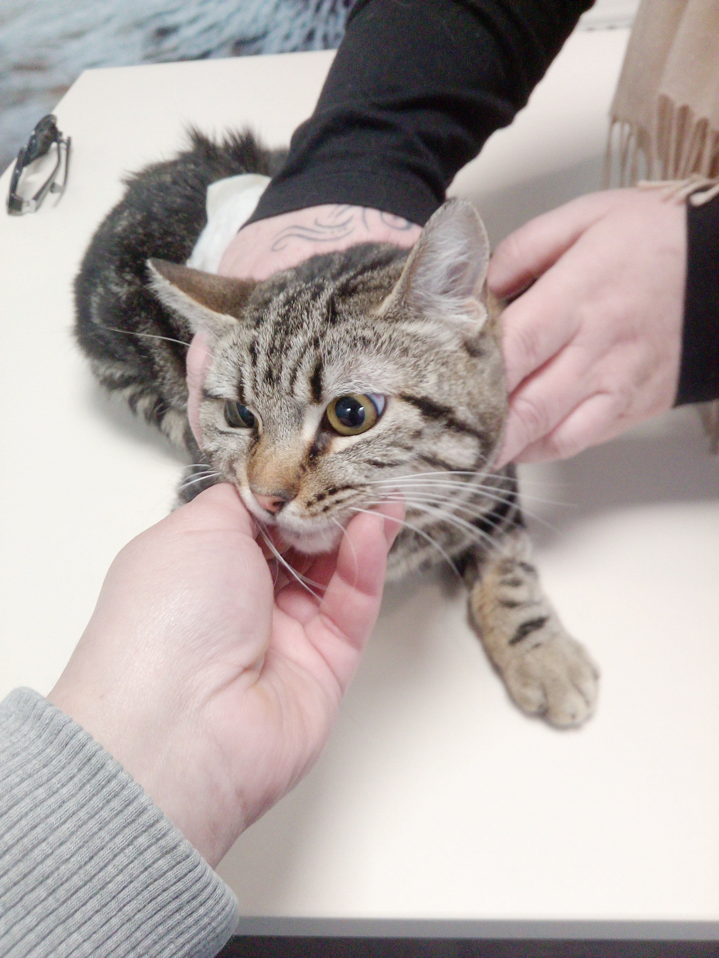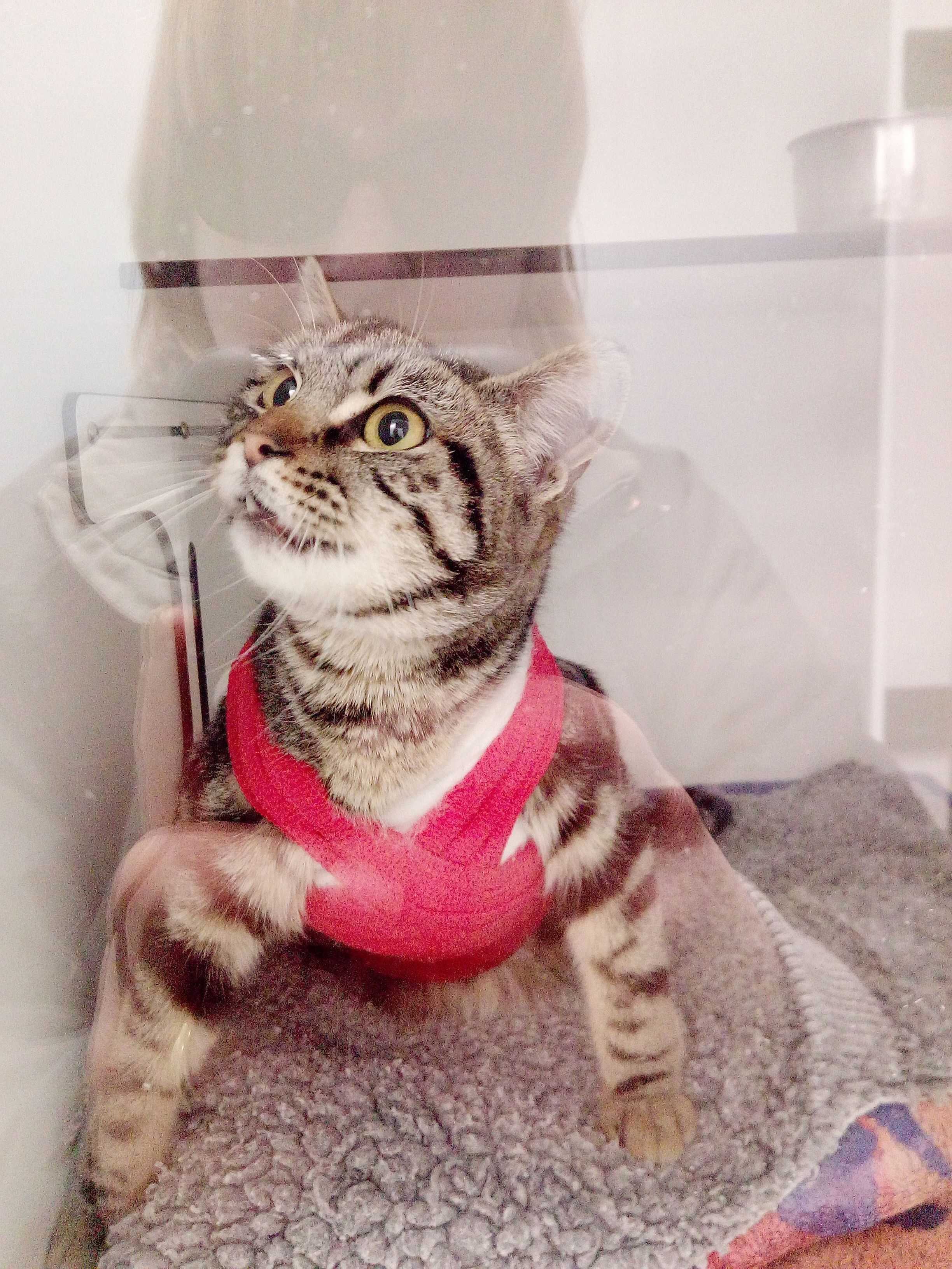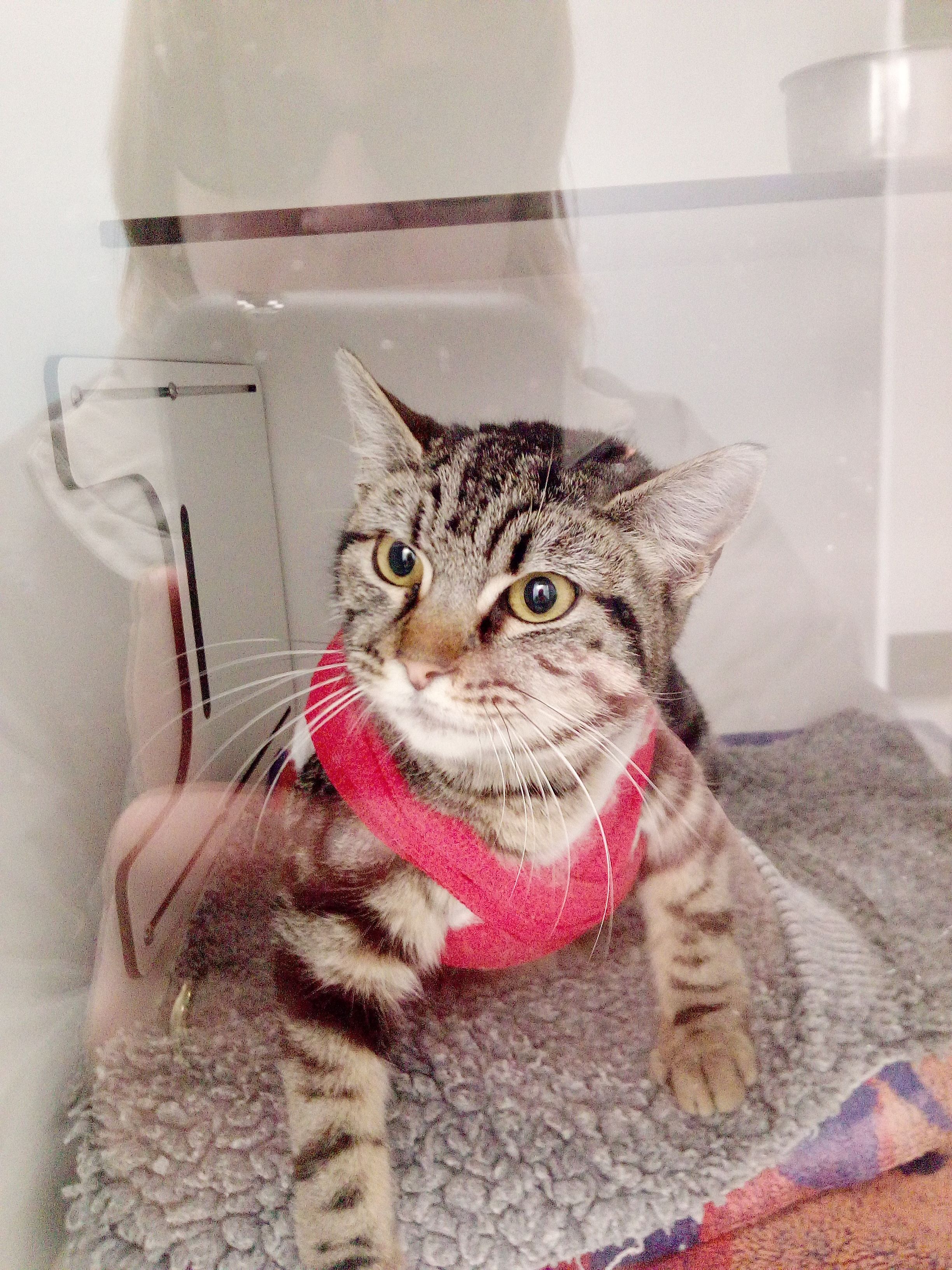 Hace tiempo que no contamos novedades sobre Ametsa. Desde que llego esta con tratamiento antibiótico, tuvo que pasar por una cirugía muy complicada para poder limpiar bien la infección que tenia en la vertebra y la impedía andar y desde entonces esta en reposo en una jaula. Contra todo pronostico Ametsa se ha ido recuperando y a día de hoy puede mantenerse de pie y ya da varios pasos seguidos sin caerse. El veterinario nos dio vía libre para esterilizarla y ademas ha dado negativo en las pruebas de inmunodeficiencia y leucemia felina. Aun debe pasar 15 días mas con antibióticos antes de la siguiente revisión pero podemos decir que es toda una luchadora. Ha llegado el momento de que comience a caminar fuera de una jaula pero todas nuestras casas están saturadas. Necesitamos una casa de acogida para que Ametsa coja poco a poco fuerza en las patas. ¡¡Ayuda para Ametsa!!