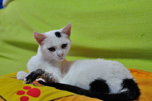 Es tremendamente mimosa, buena y adorable… se merece una familia a la que no le importe que le falte su patita… ella se las apaña perfectamente, no va a tener una vida complicada por ello.