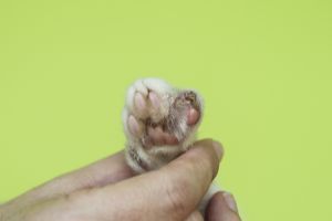 El pobrecito tiene las patas (almohadillas y deditos) con heridas, pus… está el chiquitín que no puede ni apoyar bien.