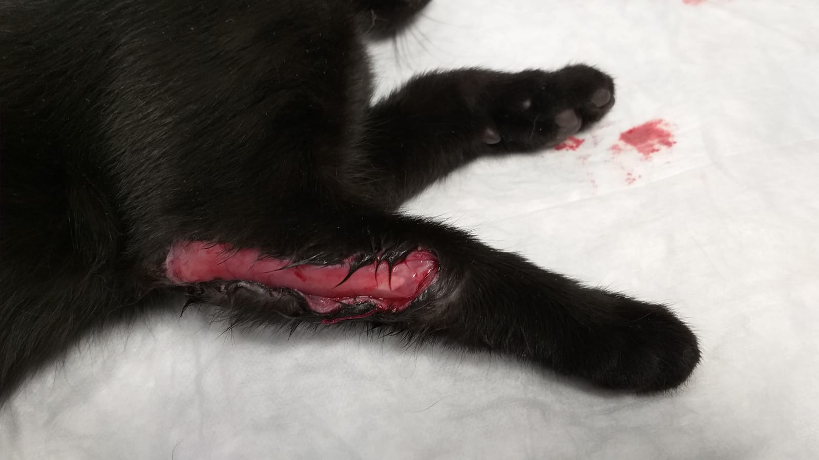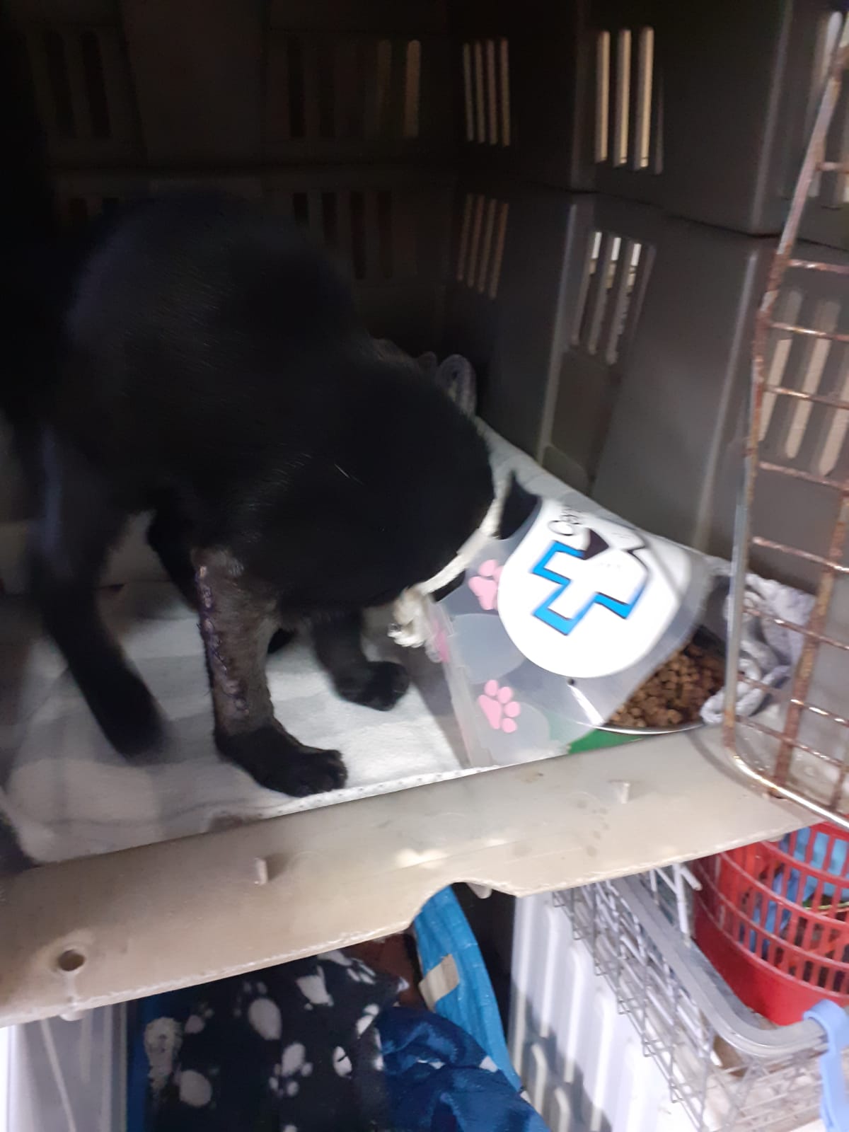 Este precioso y simpatico cachorro de unos 3 meses y medio de edad era recogido con la herida que se aprecia en la foto asi que inmediatamente fue trasladado a clinica. Alli pudo verse que no tenia nada fracturado, la herida estaba limpia , aun asi tuvieron que darle diez puntos de sutura .
