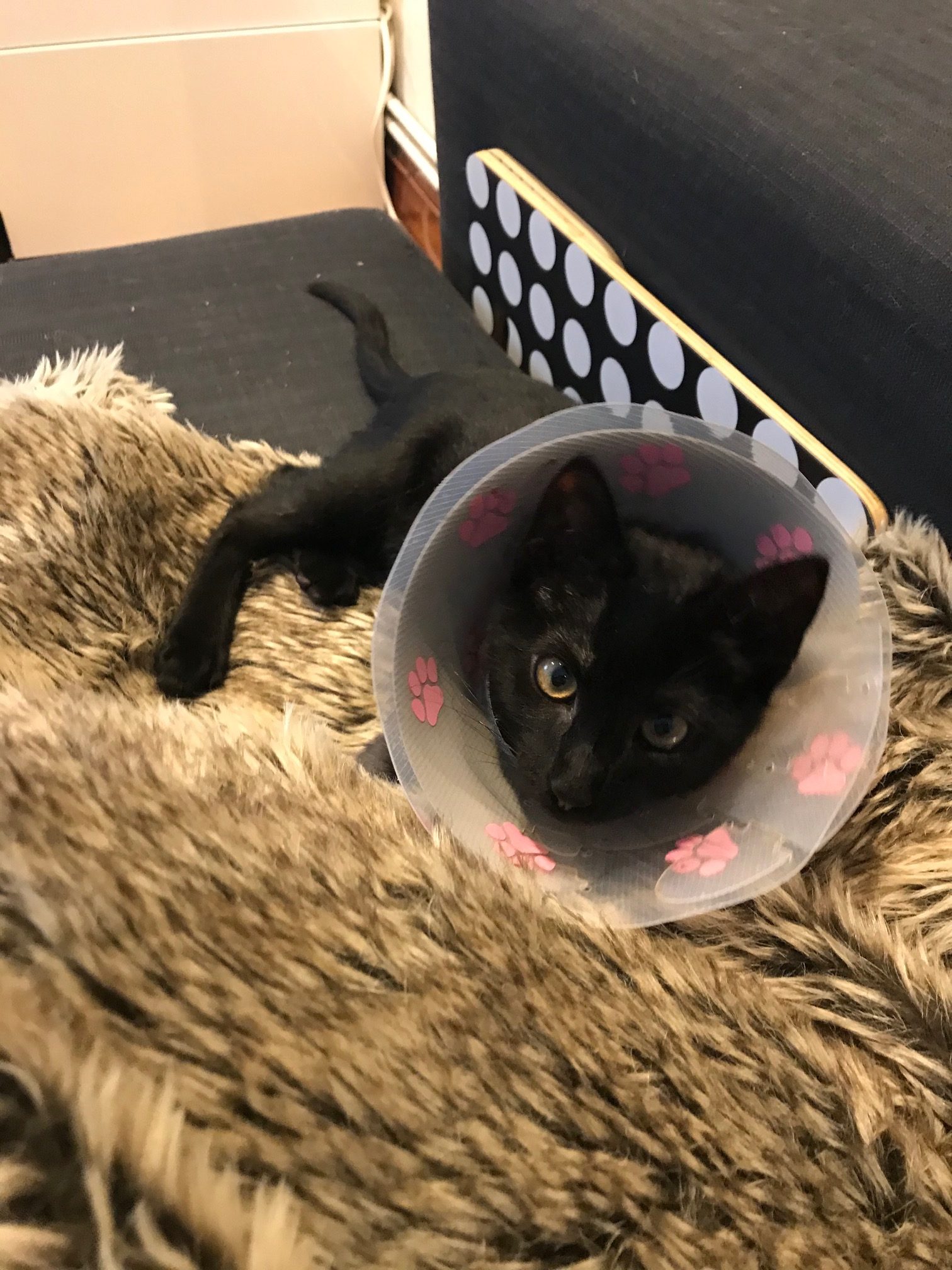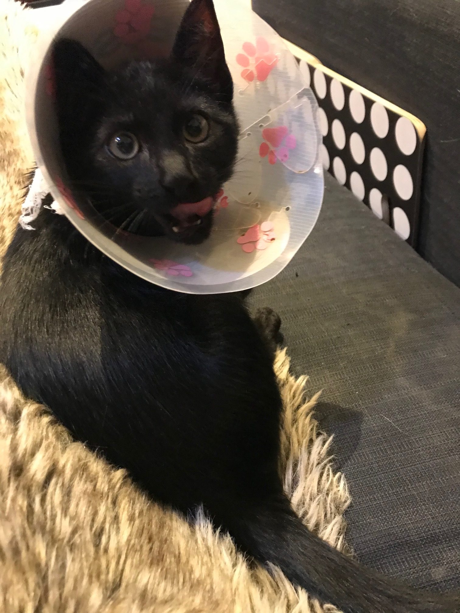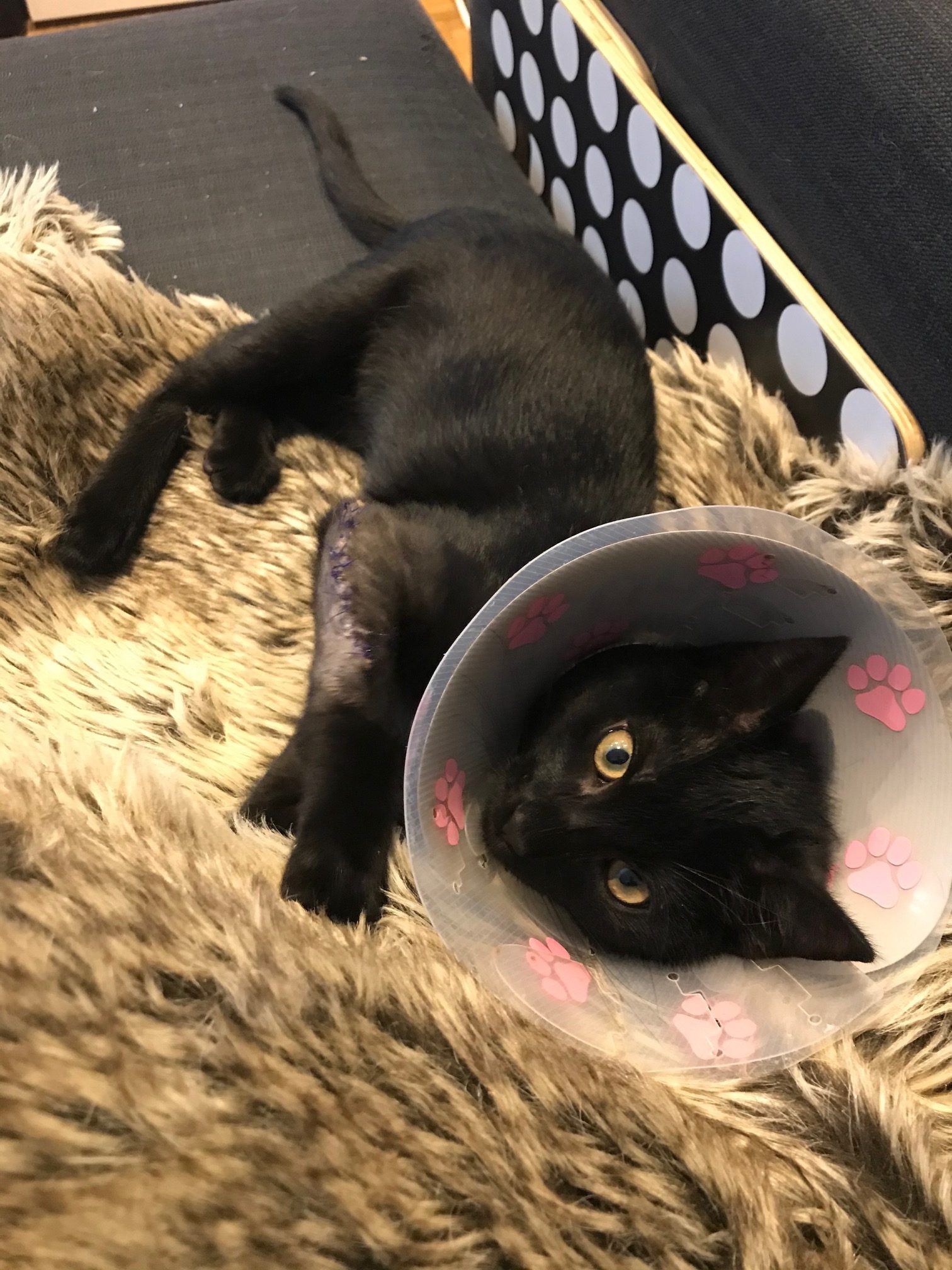 La pata la apoya sin problemas y sube y baja de un salto sin que note dolor. eso sí, al apoyarla la tiene un poco zamba hacia adentro suponemos por los puntos.