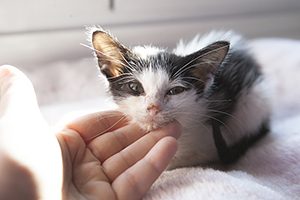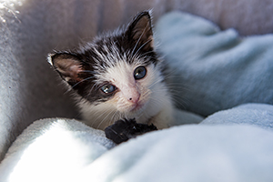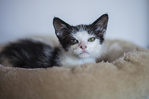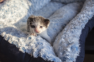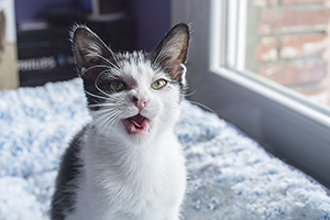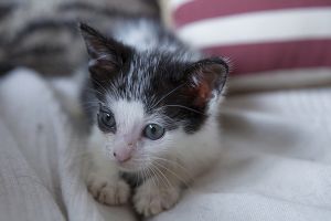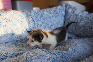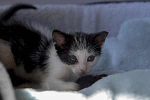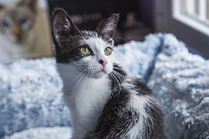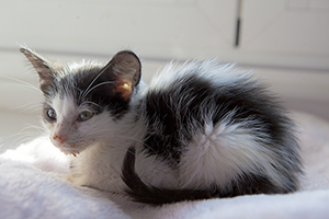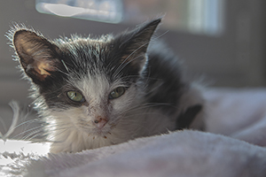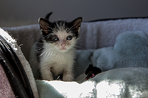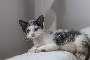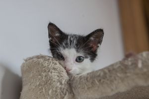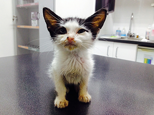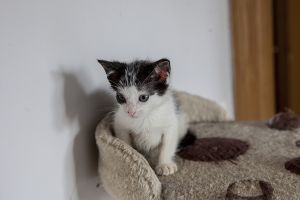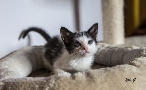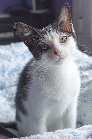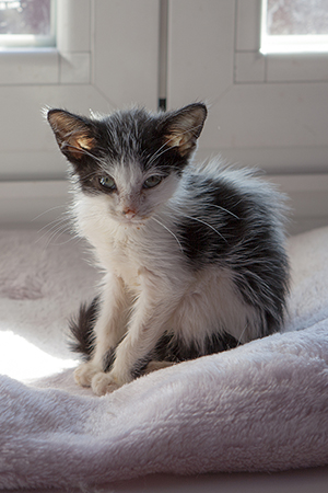 Sin duda si hay una gata luchadora, esa es Bacall. Fué criada a biberón. Estuvo muy enferma, dos de sus tres hermanos murieron, pero ella ha salido hacia delante. Es una gata cariñosa y juguetona, más bien de tamaño pequeño. Ahora mismo vive en una habitación ya que estuvo en contacto con su hermano que murió de Pif, pero ella ni rastro de la enfermedad, aunque puede ser portadora, la hacemos revisiones periódicas para saber si lo está eliminando.