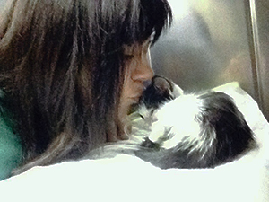«Bacall esta muy animada, come muy bien, aun le queda alguna semana para recuperar. Es adorable, si antes era cariñosa, ahora aún lo es más, te sigue como un perrito, si estas en el ordenador quiere estar en tus piernas, supongo que su ingreso no le gustó nada. Sigue esperando que alguien se enamore de sus ojos verdes».