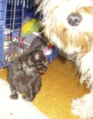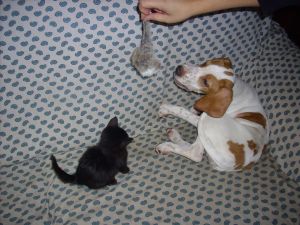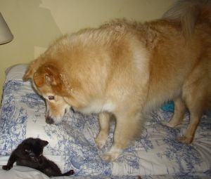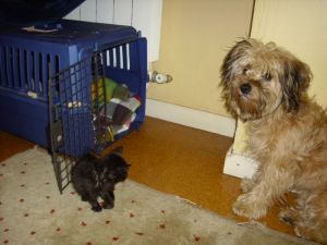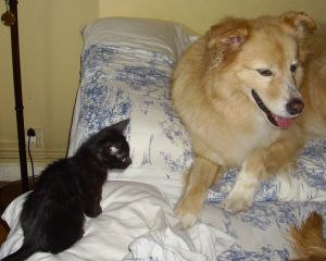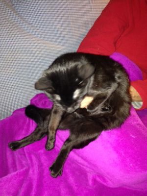 Hasta hace muy poco la teníamos prácticamente aislada para protegerla de Toby, el cachorro de acogida, es un bebé también y sin querer le puede hacer daño. Ya hemos comprobado que ella misma lo sabe y si él está en casa y despierto no sale de su territorio. Cuando está en la calle o dormido, no me preguntes porqué pero Bagheera lo sabe, juega y corre por la casa como los demás. Aun así estamos con mil ojos para evitar accidentes.