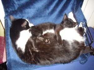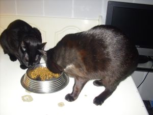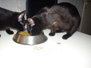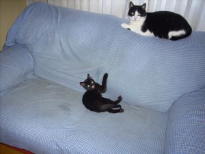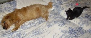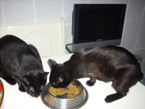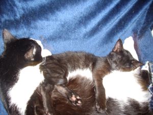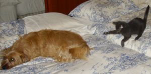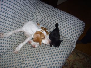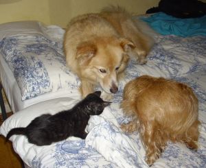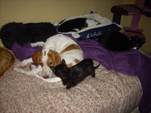 En cuanto a relaciones. Con los perros no se relaciona pero no tiene inconveniente en dormir la siesta acurrucadita con alguno. Con mi gata nada de nada, cada una por su lado, mi gata es muy suya. Con Hamlet genial desde el principio. Con Marlon normal, sin más. Ahora lo bueno. Con Isadora íntimas amigas, carreras por la casa, juegos con las cortinas, cucús en el sofá, de todo… De vez en cuando algún sopapo, bueno, ¿¿quién no se enfada alguna vez con una amiga?? Come bien pero prefiere de los grandes, el pienso que le traemos a ella ha dejado de gustarle. Le suelo poner un cuenco con eso y así no le queda otra que comérselo.»
