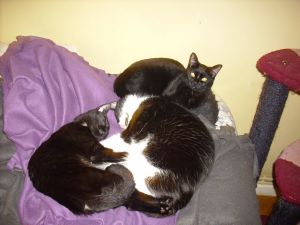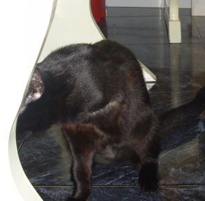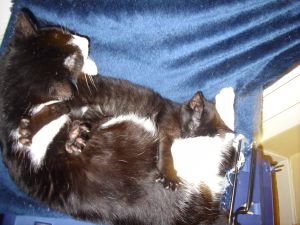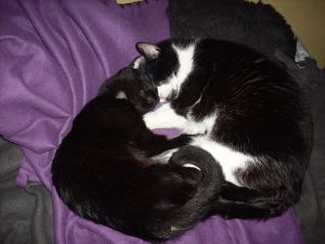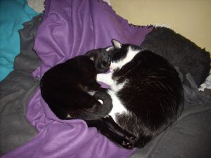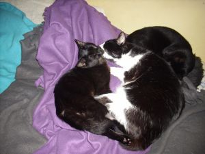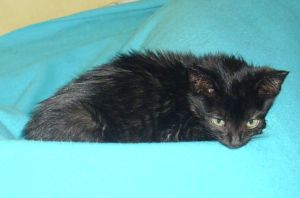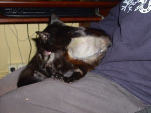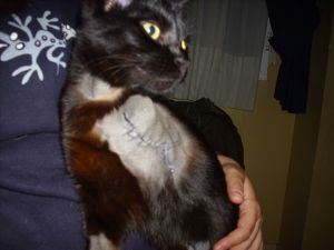 «Ya esta en casita tranquila, ronroneando y buscando mimos. Ha ido a la caja, acaba de comer un poco, aun no ha bebido agua. Si en rato no lo hace le daremos con jeringa. Ya veis que mi gordi la esta cuidando muchísimo, el ya sabe lo que es que le amputen una patita. De momento no notamos cambio en el carácter, esta tan amorosa como siempre.»