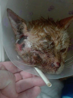 Esta con drenaje. Hoy y a pesar de la escrupulosa limpieza de estos dias seguian saliendo gusanos. Mas estable han podido darle «un baño humanitario» y además ¡ha comido!! tal como podéis ver en el video. El estado es malo, pero el tiene ganas…Se ha dejado manipular en todo momento, pero puede deberse a que se encuentra muy malito.