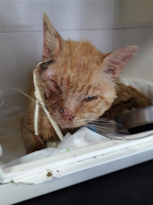 Bartolo nos llegaba el pasado lunes de Urgencia. Los veterinarios aun no dan crédito a lo que vieron y a lo que en estos días están viendo… Tenia cientos de gusanos y larvas en la cuenca vacía del ojo derecho, en el paladar… y también en el cuello. La parte derecha de la cara está necrosada en varias zonas y no descartan que acabe cayendo.