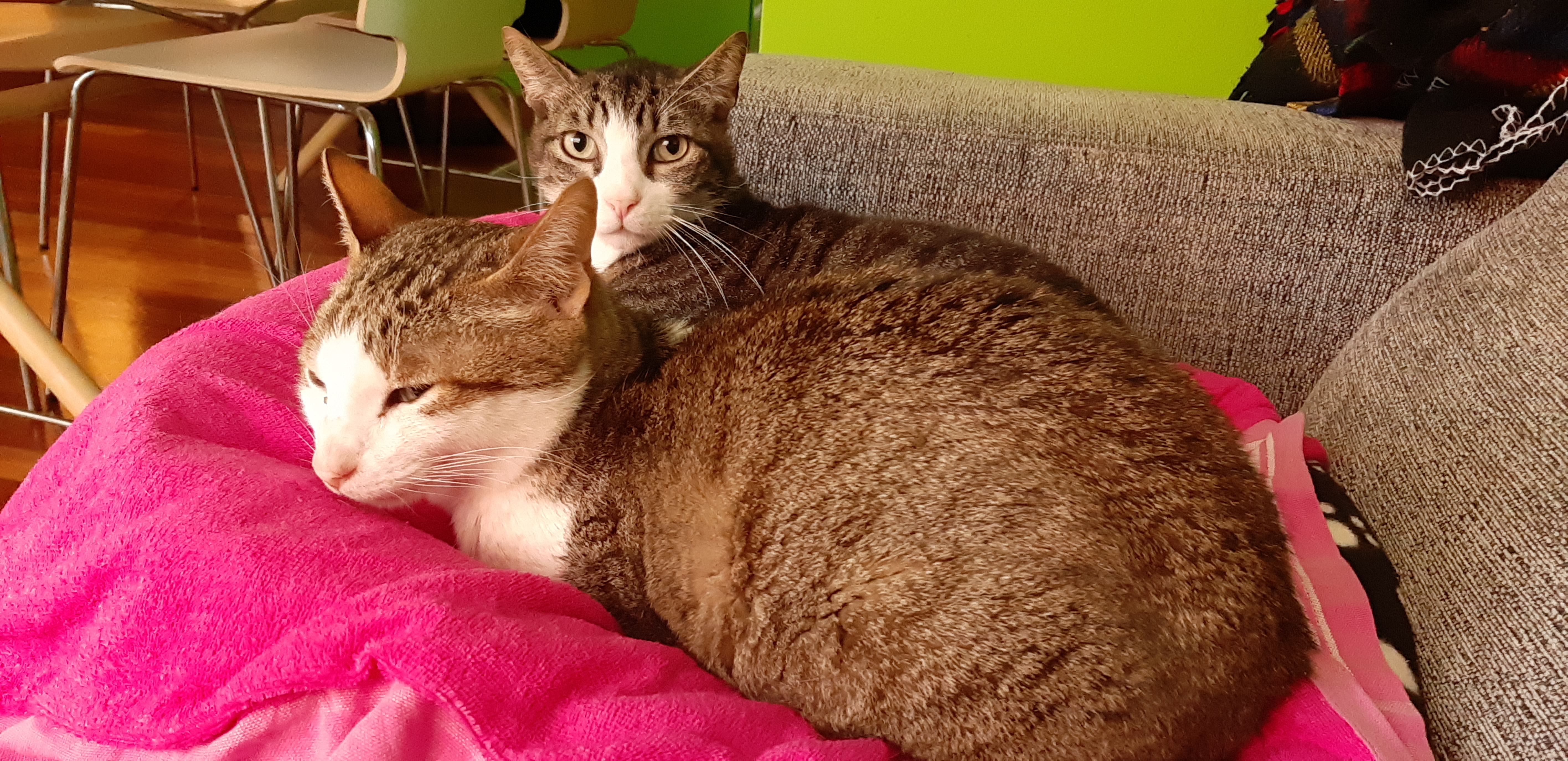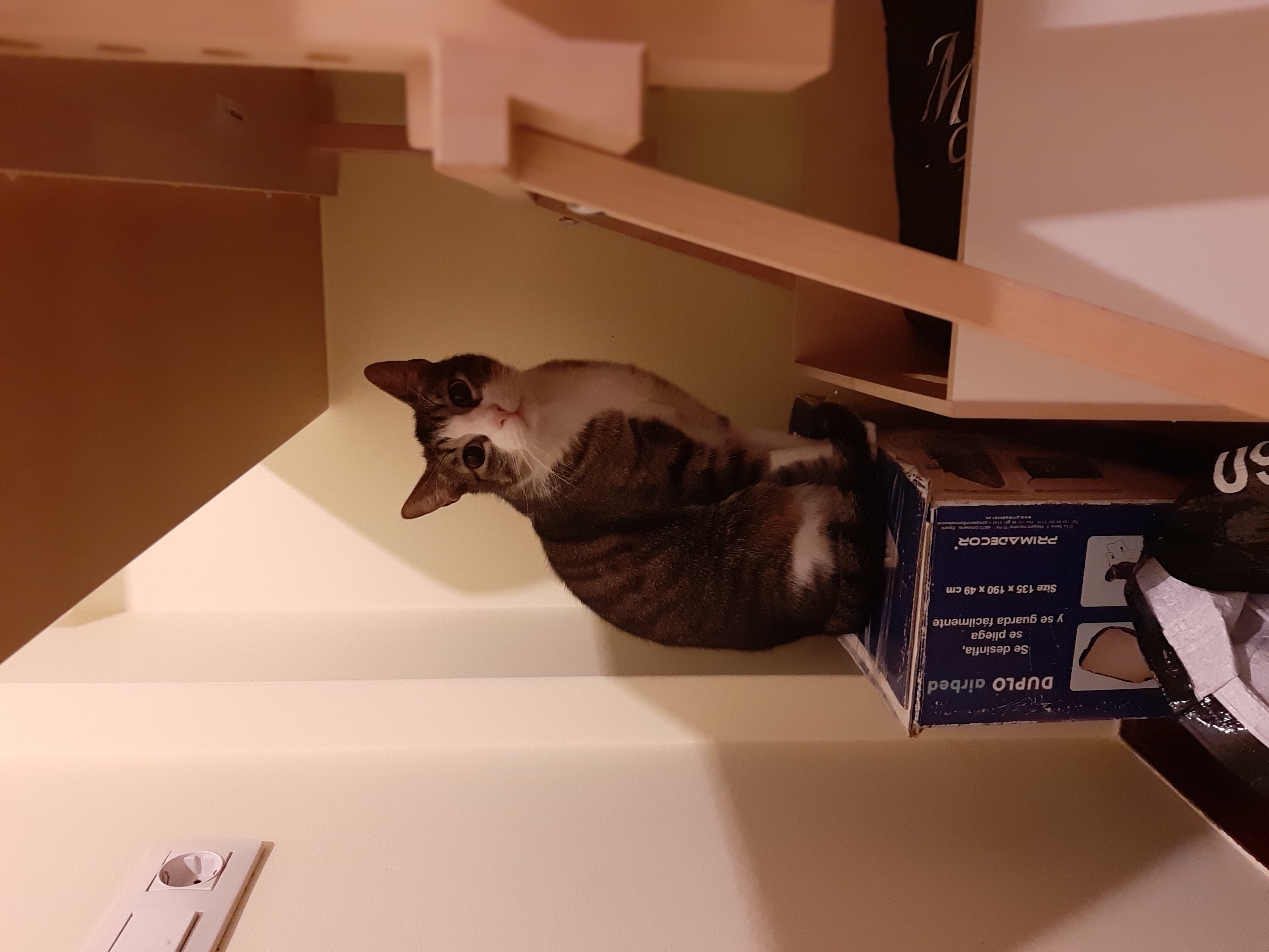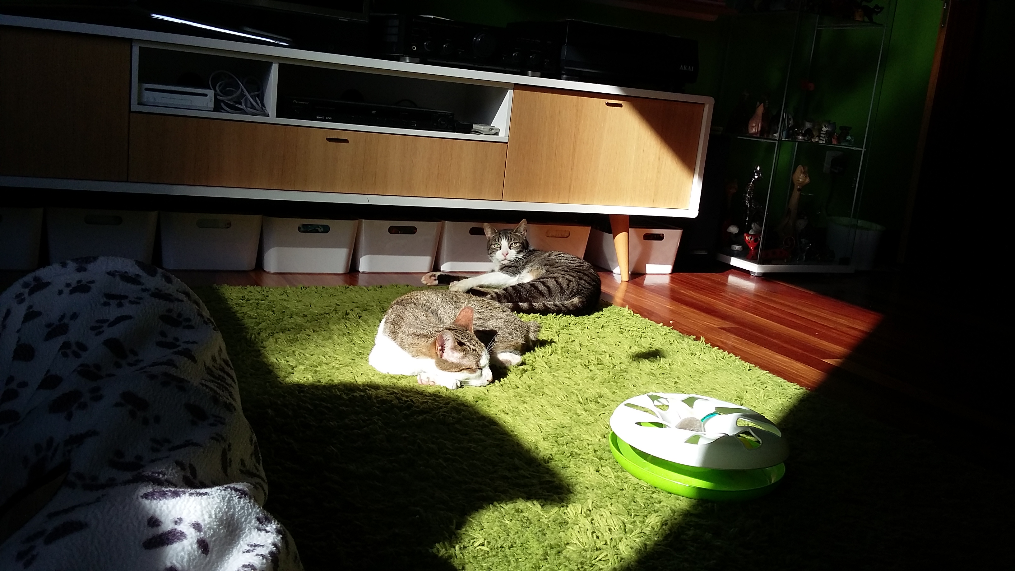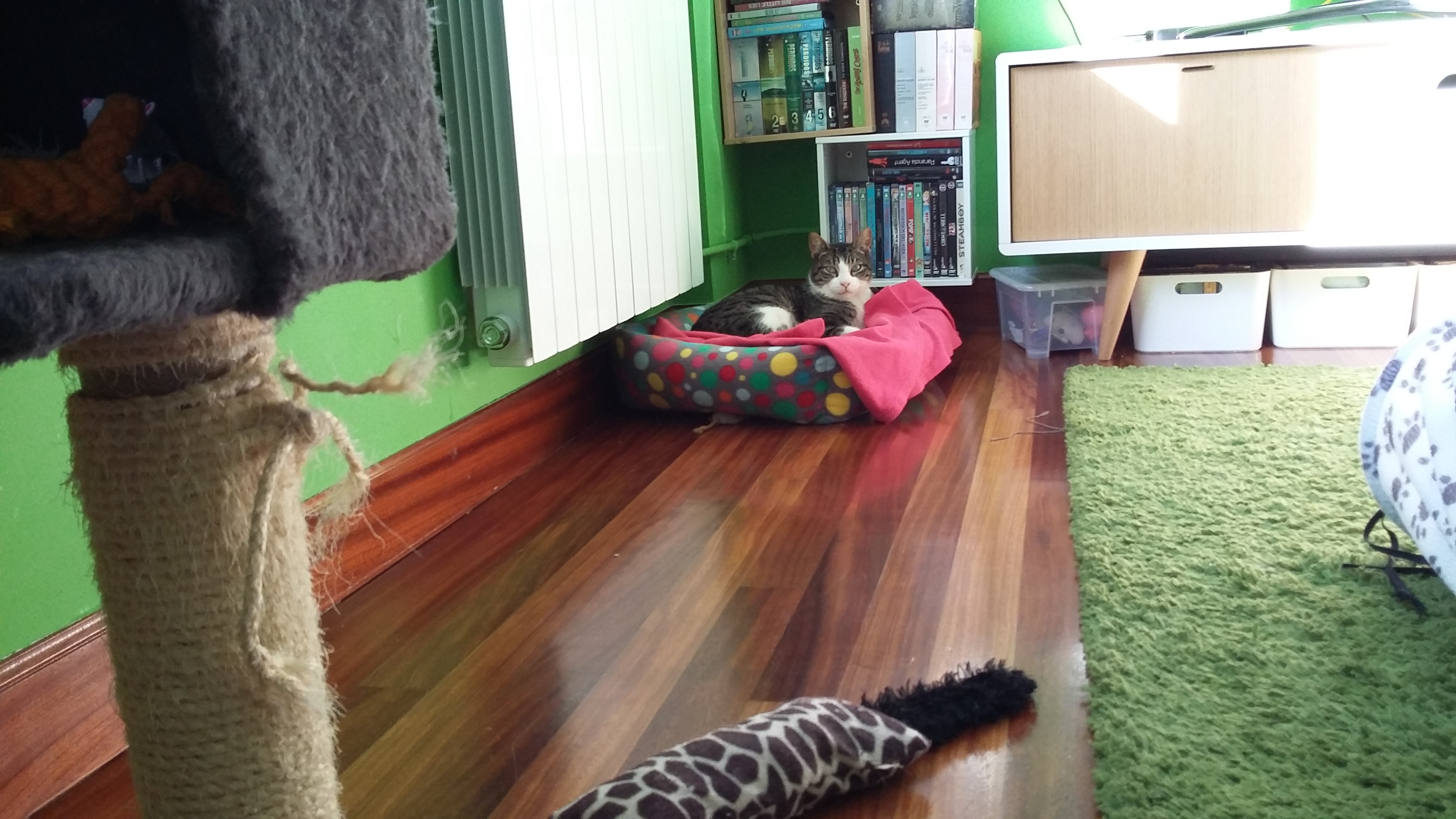 Hola!Pues el gordo.sigue igual de timido, si bien ahora si que viene a dormir a la sala cuando estamos nosotros,es raro que se nos acerque. Con mis gatos se lleva muy muy bien,y es muy juguetón,él solo se entretiene muchísimo.Come estupendamente,y se le está poniendo muy bonito el pelo.Hoy le he estado acariciando, vamos,le pillo descuidado o bien donde no pueda escapar y le toco el lomo y la naricilla,me mira con cara de decir «qué hace esta loca!!».Lo ideal para el es una casa con más gatos,son quienes le están haciendo ser más sociable y dejarse ver.