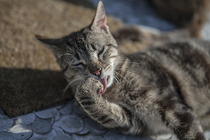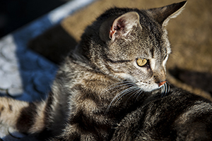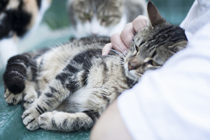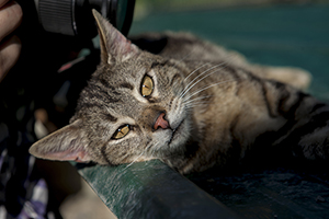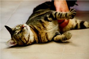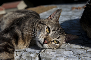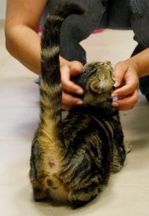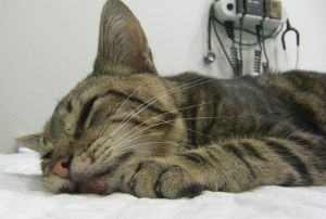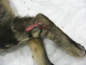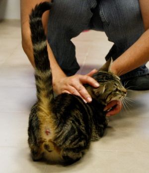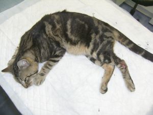 El gato estaba desconfiado en aquel momento, seguramente dolorido, y echaba la zarpa y gruñía, así que hubo que sedarlo para hacer una exploración concienzuda. No se encontraron fracturas óseas, y sí neumotórax y probable afectación de la vejiga (pero sin rotura de ésta, que se veía íntegra en la radiografía), pues al palpar el abdomen salió sangre por el pene. La pata trasera izquierda presentaba un corte de la piel que lo cerraron con grapas. El gato tenía abrasiones diversas (barbilla y cara interior de alguna pata).