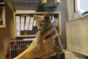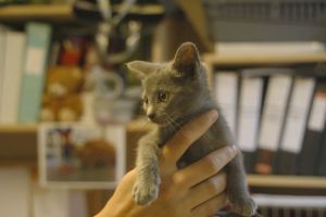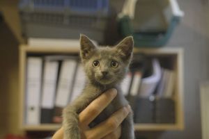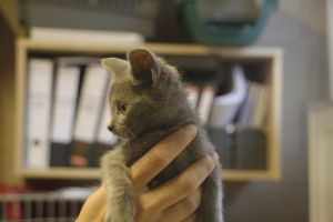 Buckler es un precioso gatito azul ruso con ese color gris tan bonito.