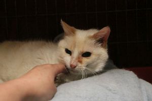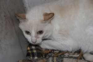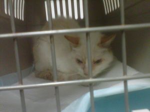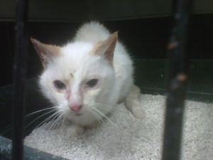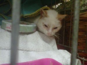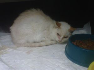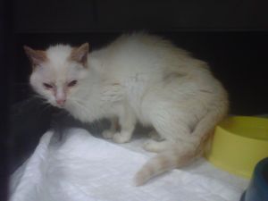 Llegó a la perrera y por su estado, parecía una gata más bien anciana…la pobre simplemente por su estancia allí se puso malita…empezó con un herpesvirus que le afectaba ojillos y afección respiratoria…pero adelgazó alarmantemente por no comer tampoco.