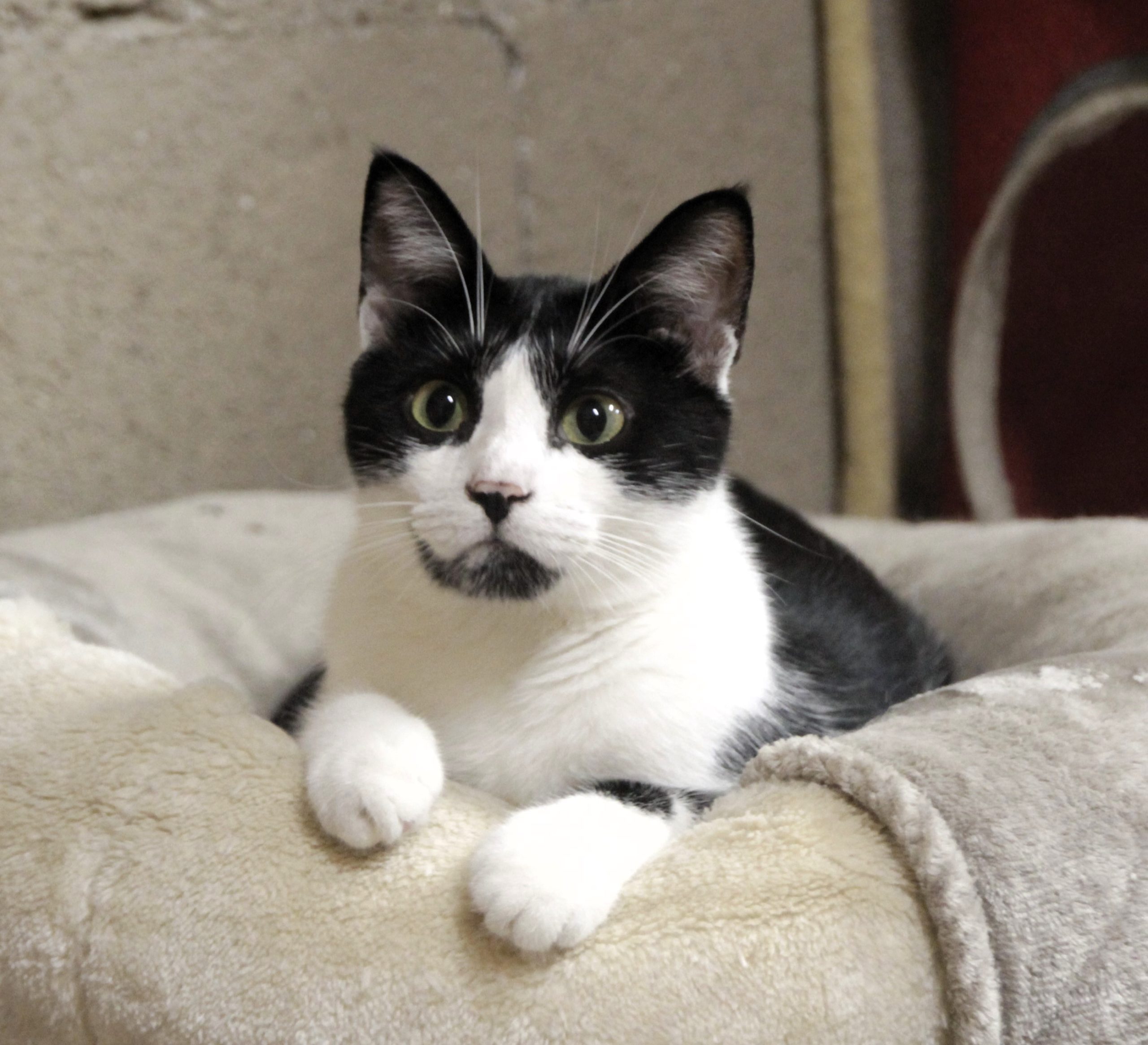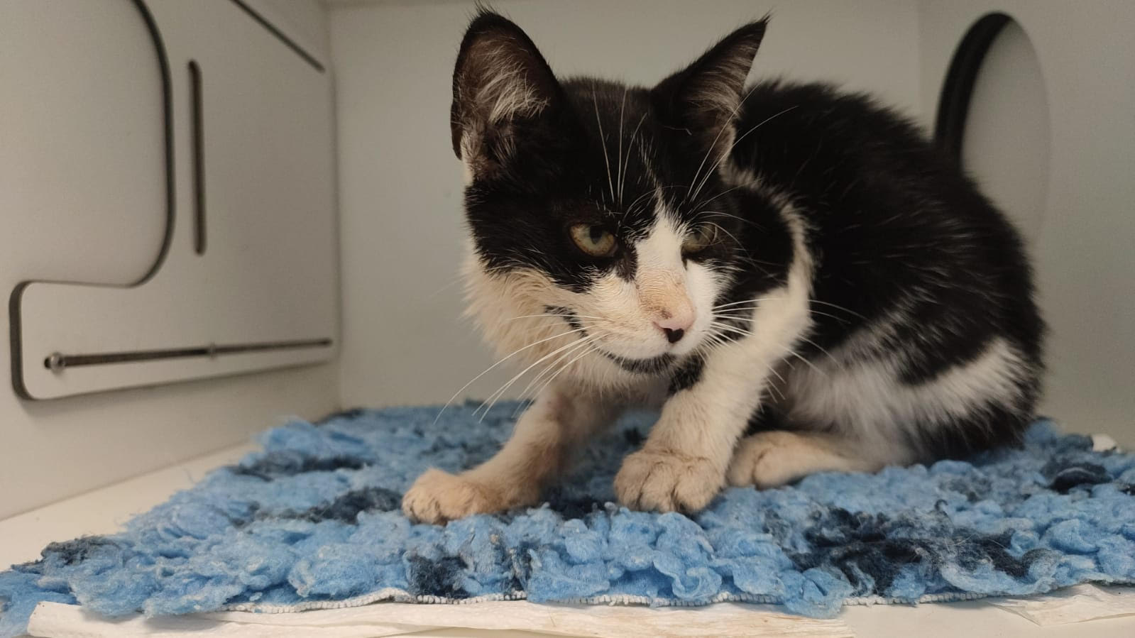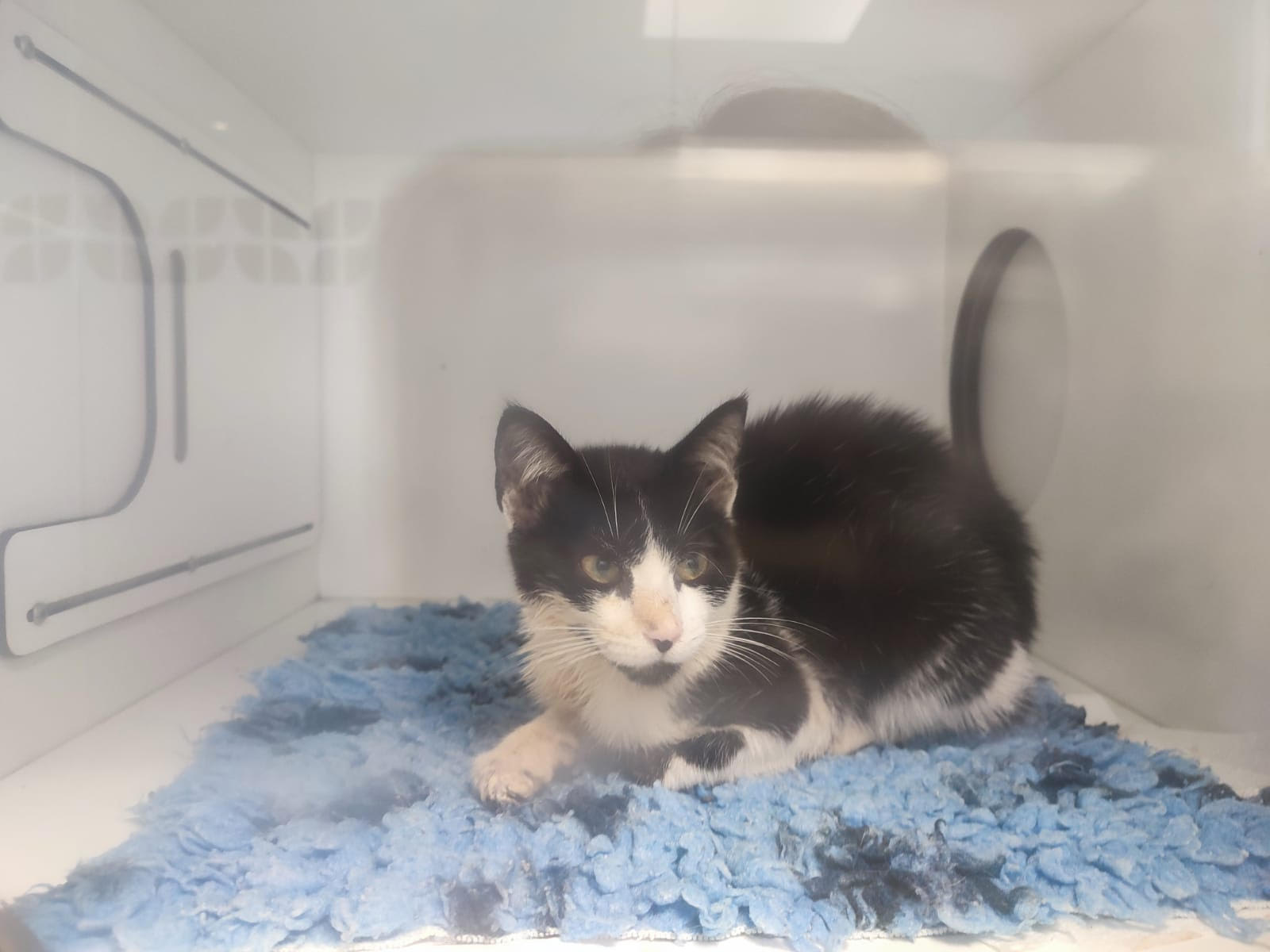 Es un peque adorable que solo quiere mimos pero que al no tener olfato no vista en la clínica deben estimular constantemente para que coma,