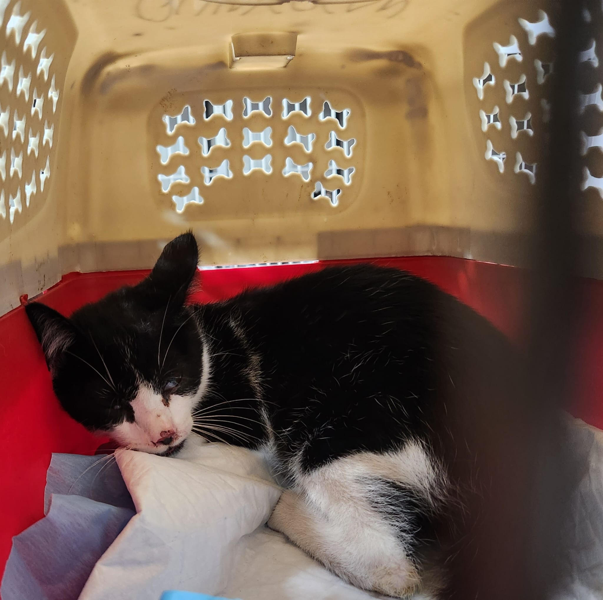 CHIRIMOYA  es este peque de unos cuatro meses aproximadamente que nos llegaba hace una semana con un supuesto atropello.A nivel óseo no tiene nada , pero esta ciego y no huele. No sabemos si ambas cosas son consecuencia del accidente o congénito así que debemos hacer pruebas para ello, la mayoría costosas. Tac, infecciosas..