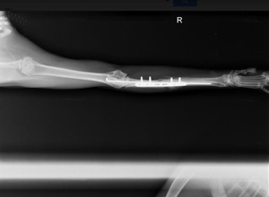 Chuck fue recogida la madrugada del domingo malherida en mitad de la calle. Las primeras pruebas que la hicieron mostraban múltiples fracturas además de la herida abierta en pata: fractura en radio y cubito de la extremidad delantera derecha, fractura de acetábulo de cadera y luxación sacro iliaca. La cirugía no podía demorarse mucho pero lo cierto es que la analítica ha mostrado una anemia importante por lo que hoy mismo ha recibido una transfusión de sangre. Esperemos que la anemia vaya remitiendo y pueda ser operada lo antes lo posible.