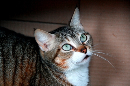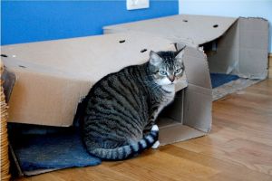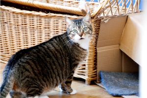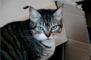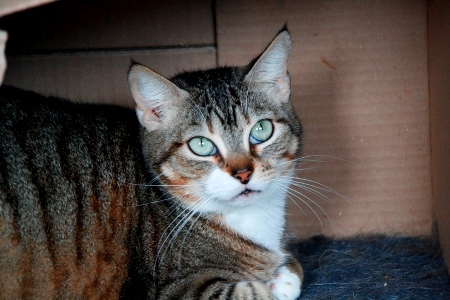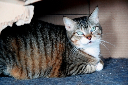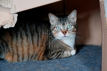 Nuevas fotos de Cleo que sigue entre nosotros, convive con su madre Cora y sus hijas Peny e Indar, Cleo es muy tranquila y redondita, le encanta estar tumbada dentro de las cajas de cartón y no da ni pizca de guerra, pero ya es hora de que conozca un hogar para ella solita