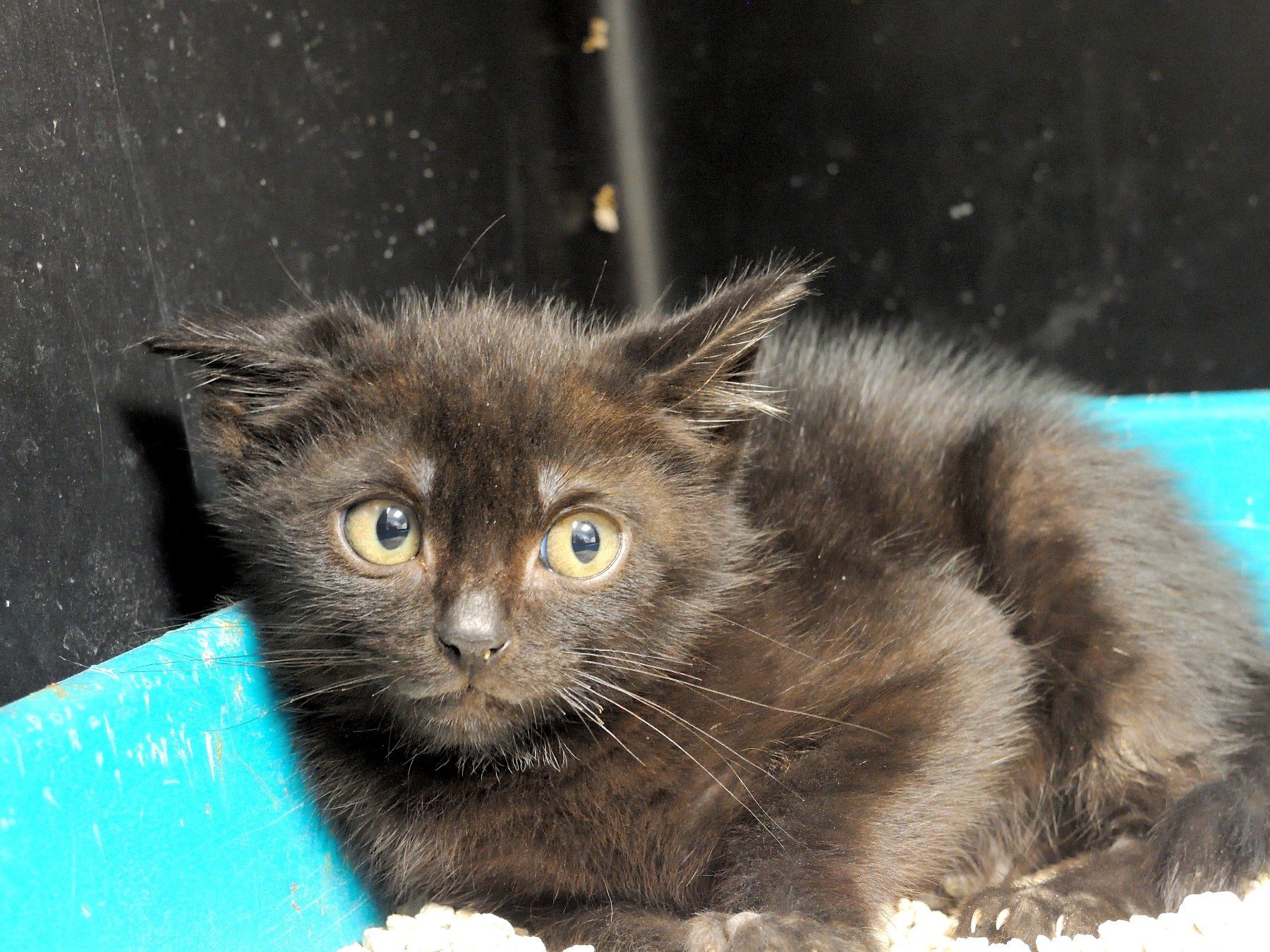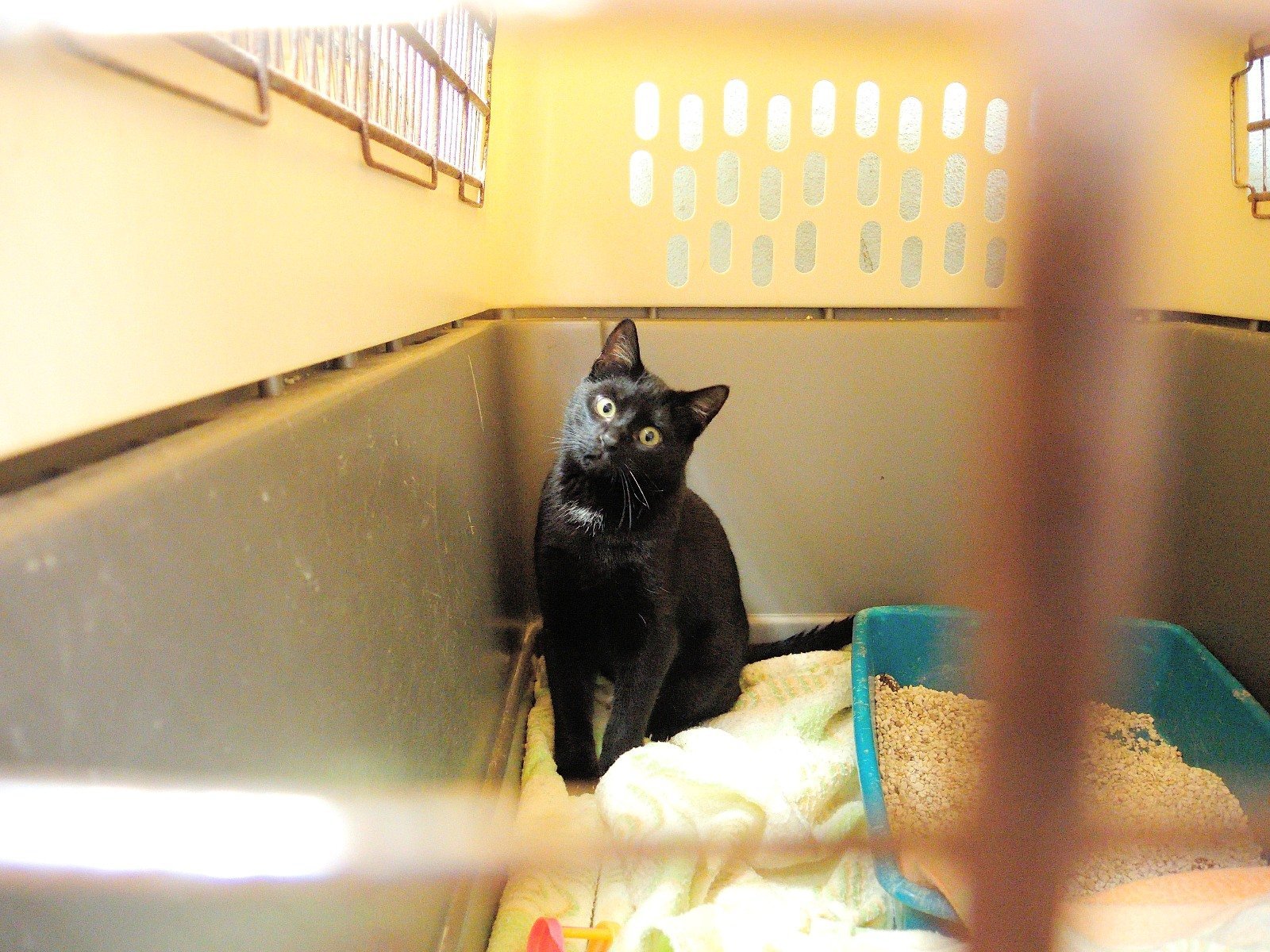 Damasco ha crecido y esta muy guapo y simpático; muestra mucho interés por los gatos de las jaulas contiguas y le gusta que le hagas tonterías desde la puerta. Si luego se la abres e intentas acercarte más puede recular y desconfiar, pero siendo cachorro aún cambiará seguro.