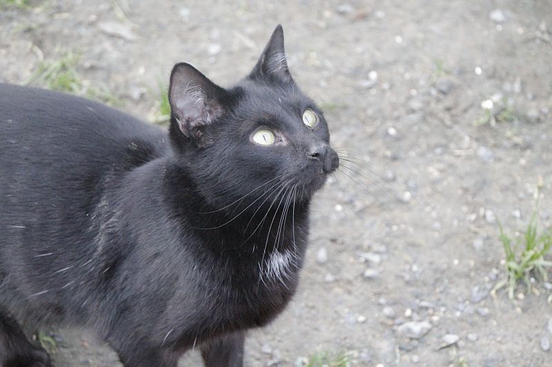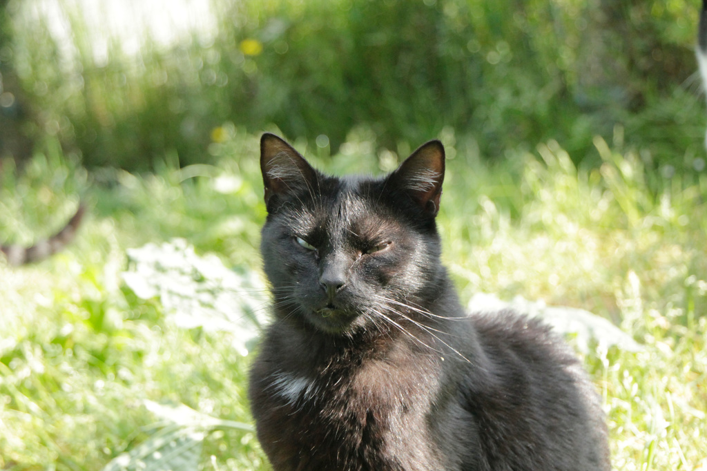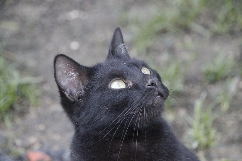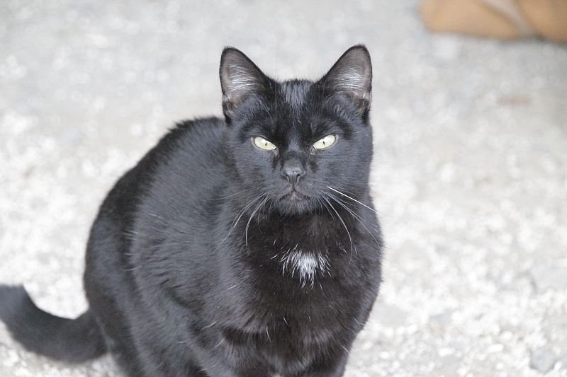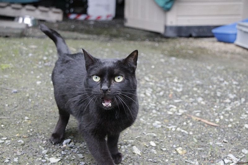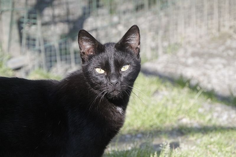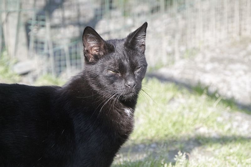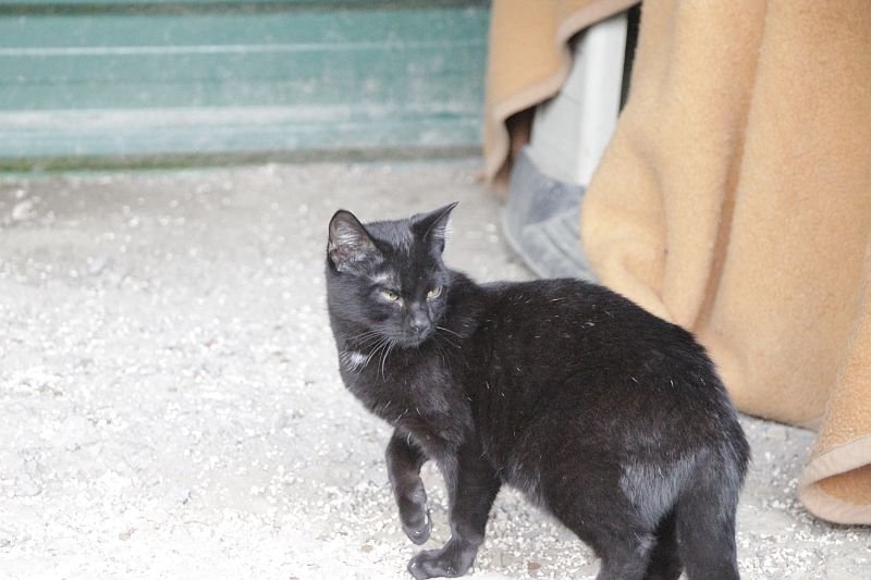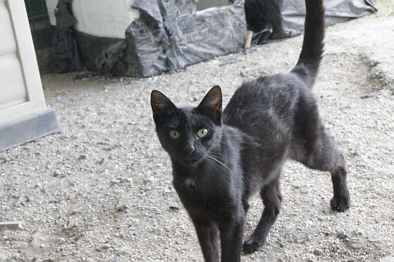 Cuando llegó a finales de 2017 era un cachorro. Cuando entramos al recinto nos recibe porque sabe que vamos con comida de lata. Si bien es confiado tiene ciertas malas maneras, como que puede pegarte si le llevas acariciando un rato; en realidad no son malas maneras exageradas. Ha mejorado mucho porque al principio rehuía las caricias y ahora no, pero mantiene ese punto de independencia típico de los gatos no demasiado apegados.