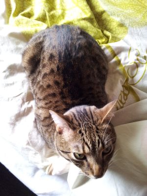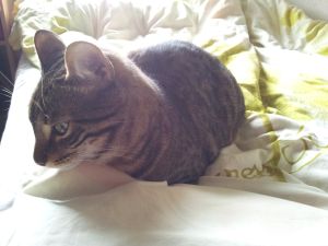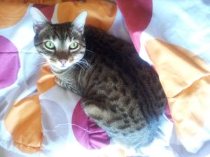 Sigue siendo un diablillo, y apenas se deja hacer fotos. Aunque sea muy fotogénico, ¡parece que no le gusta nada! Estamos muy contentos con él, no para que correr por toda la casa, le encanta las bolsitas de comida en salsa de Hills, le chiflan las cañas con plumas para jugar. En fin, como he dicho antes, un pequeño diablillo, aunque uno encantador…