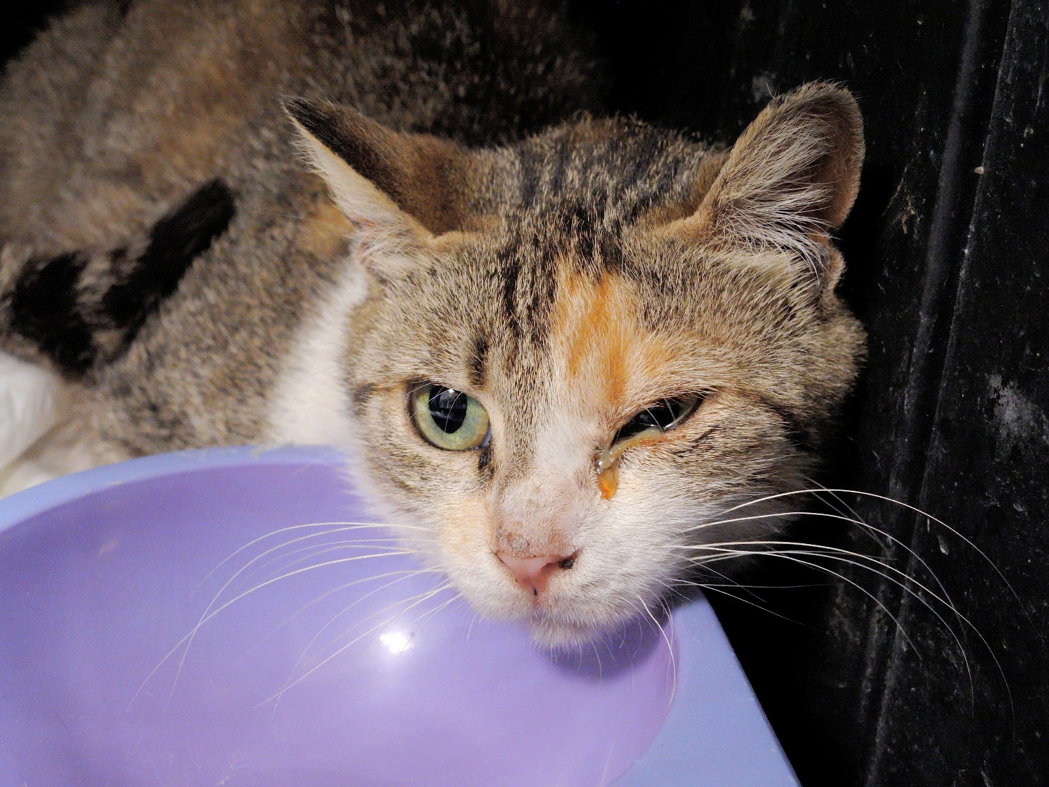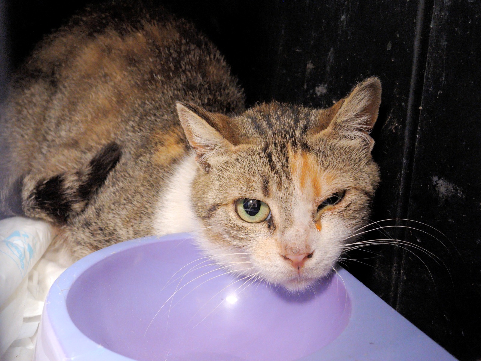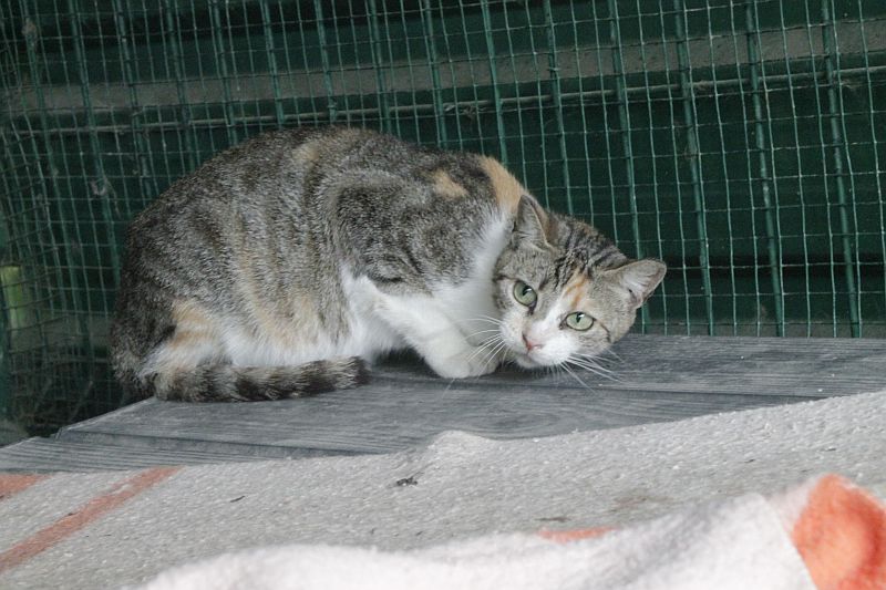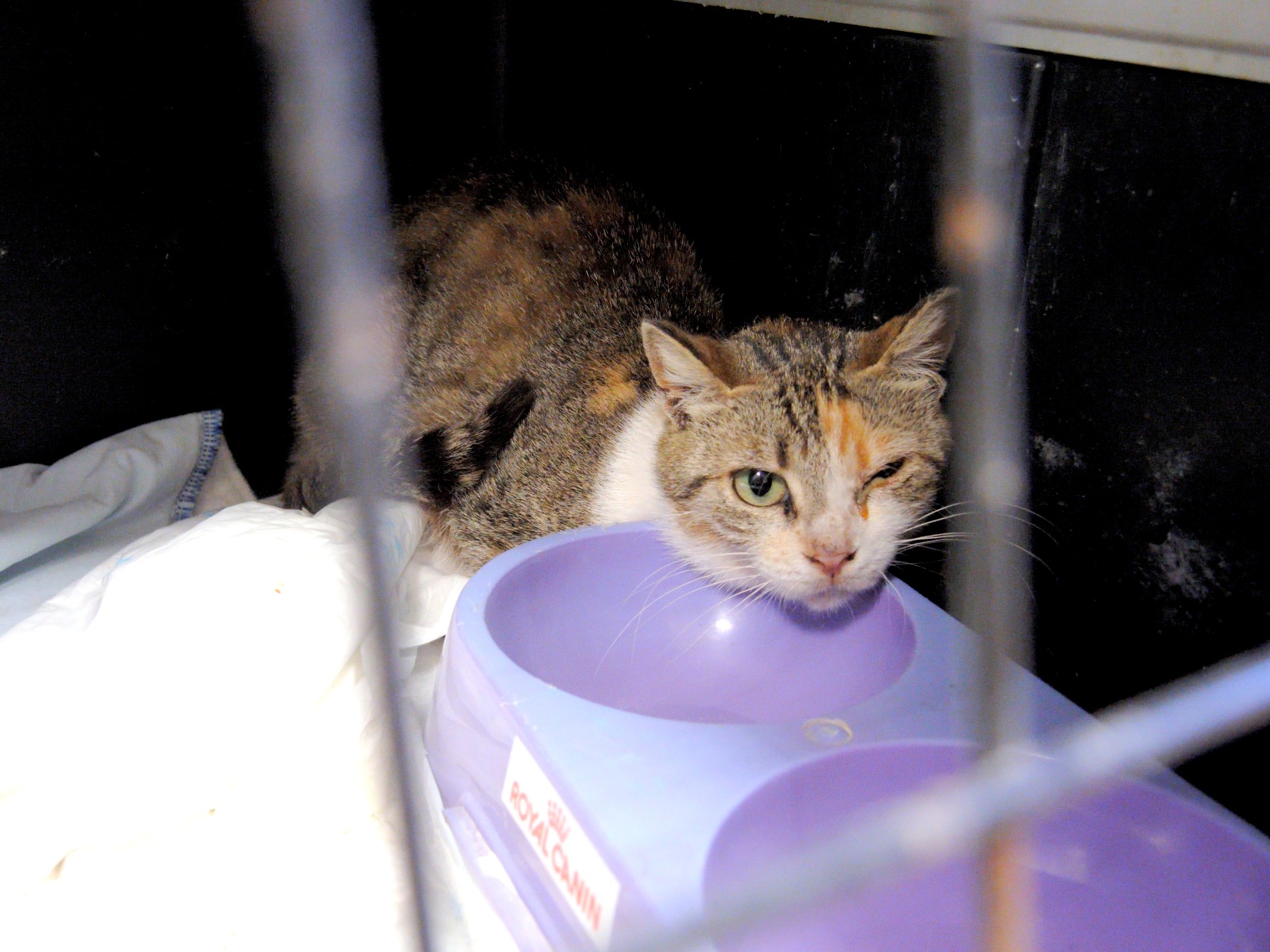 Dedee es una gata joven inmunodeficiente que ha sido esterilizada recientemente y que como podéis ver sufre una secreción en el ojo, suponemos, debido a la bajada de defensas de la cirugía. Es una gata muy huidiza que por el momento no confía en nosotros, pero que esperamos podernos ganar, poco a poco, cuando se recupere. Nuestra pena es tener que verla crecer en una jaula.
