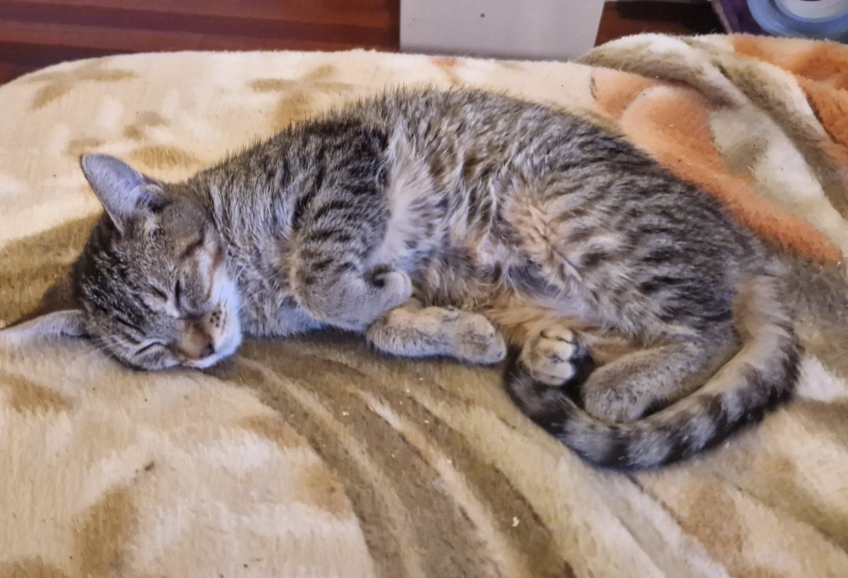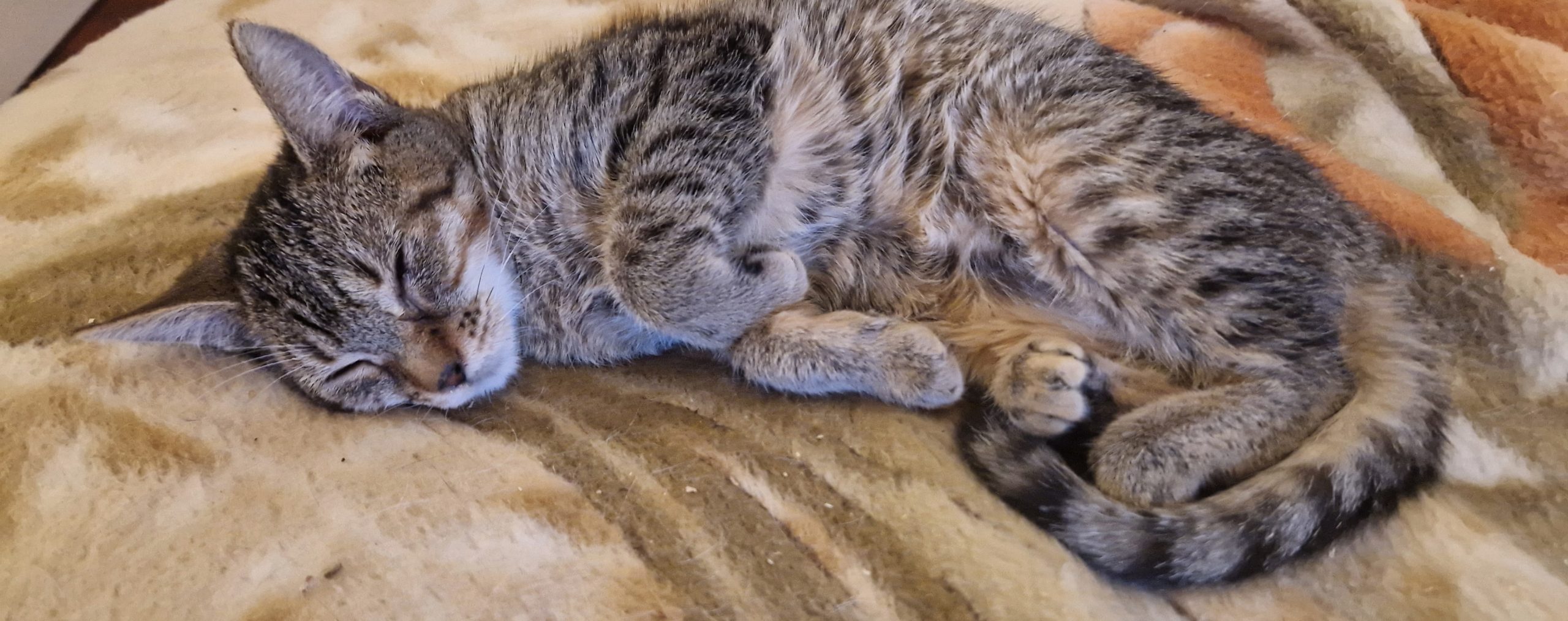 DONATELA llegó hasta nosotras en Julio junto con su hermana RAFAELA tras pasar por ingreso en clínica. Tenían otros dos hermanitos que no consiguieron sobrevivir… DONATELA es muy juguetona y la hemos tenido que cazar dormida porque en todas las fotos sólo salía un borrón. 🙂