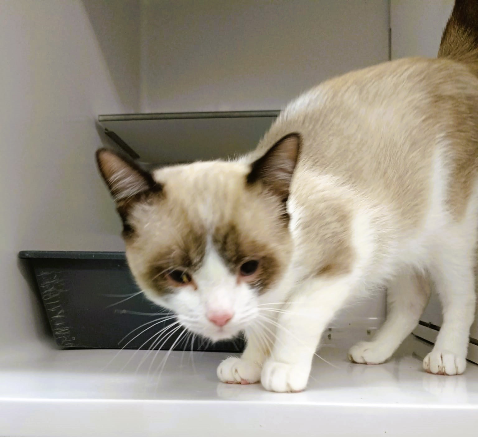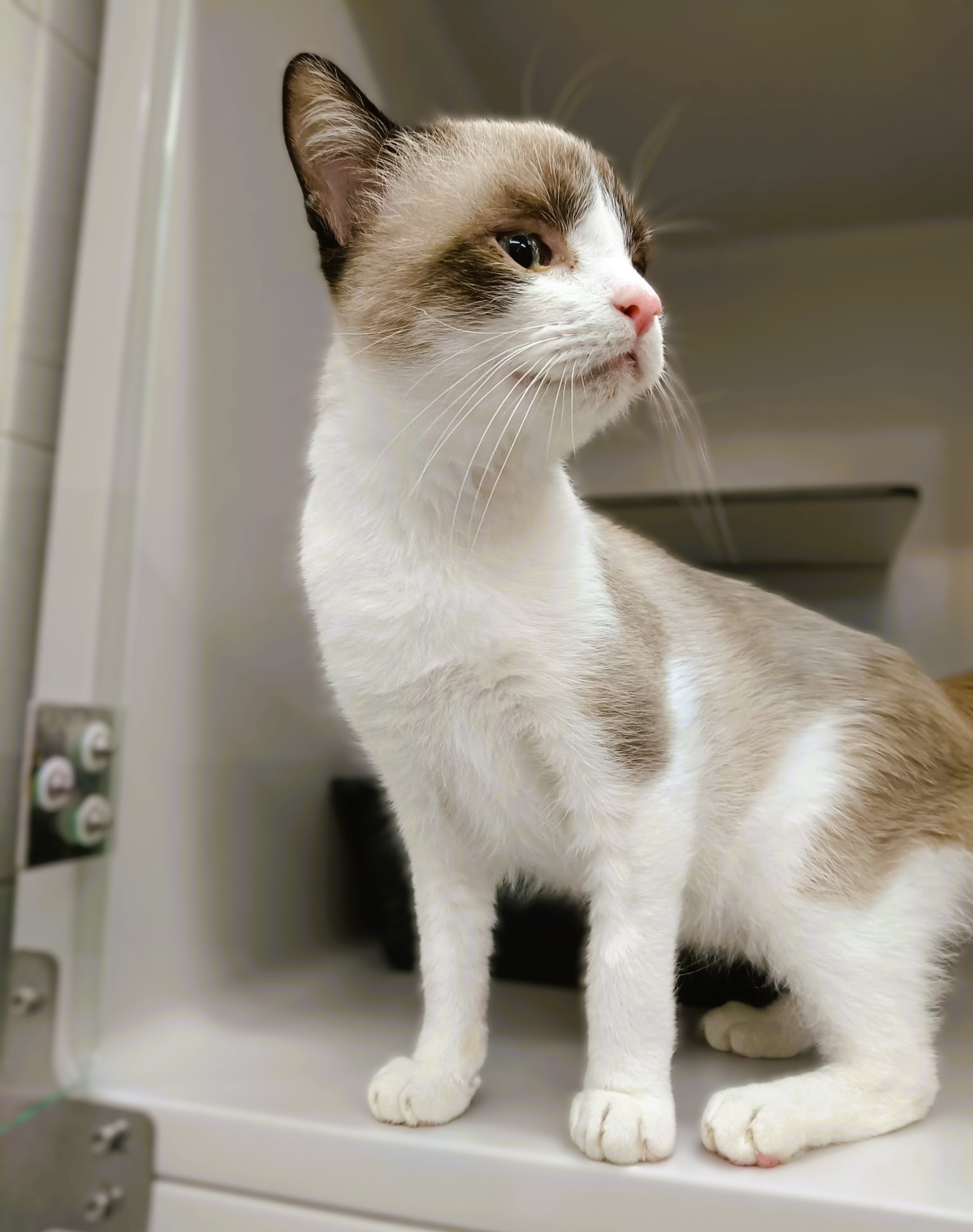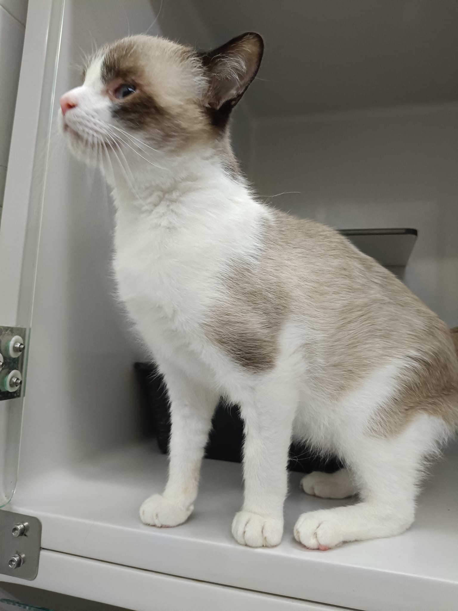 Es un gato tierno que aún no ha cumplido un año, muy cariñoso en cuanto alguien se acerca comienza a ronronear y a pedir caricias. Ideal para un hogar tranquilo, donde pueda sentirse seguro y querido.