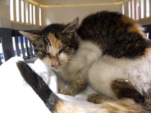 Esta gatita tricolor, preciosa a pesar de la suciedad nos llegó ayer con fractura en cuartos traseros.