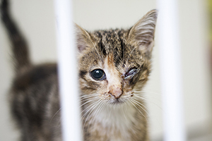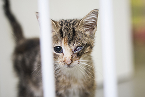 Éboli es una gatita de unos 2 meses y medio que ha llegado en muy malas condiciones, estaba muy sucia, con hambre y con un ojo muy mal, creemos que del otro ojo tampoco ve, ya que se choca con todos los armarios y aunque se acabe el camino ella sigue andando normal. Estamos a la espera de que nos reciba la especialista en ojos para valorarla.