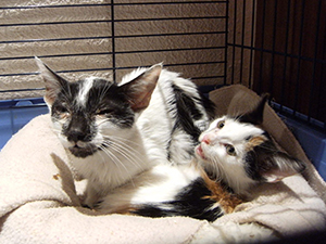 «Hoy por la mañana porque ayer yo creo que andaba la pobre con fiebre y la gata estuvo unas horas con una actitud muy triste (hasta dormía en la arena; yo creo que con la fiebre tenía calor y prefería eso a la cama). Eso sumado a que ni con la doxiciclina ni con la amoxicilina-clavulánico se han ido los mocos (han ido yendo a más). La llevamos al veterinario, yo pensaba que la gata volvería a casa, pero me la veterinaria me ha dicho que tiene 38.000 leucocitos, una barbaridad, así que se queda ingresada unos días. Lo bueno es que esta gata come sola y muy bien. Esta mañana la actitud era buena».