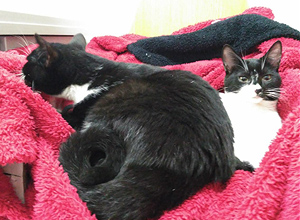 Luken es la mas tranquila y mimosa de las dos; la encanta jugar con los ratones de tela y se tumba para que la rasques la barriga. Está obsesionada con la comida….