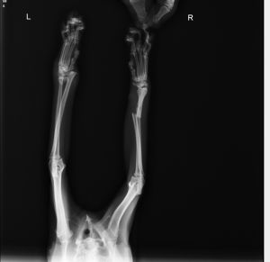 La pobrecita no puede ni levantarse, la llevamos de urgencia a la clínica y las cosas están peor de lo que imaginábamos… no solo tiene una patita rota… tiene las dos delanteras, en la izquierda fractura de carpo y en la derecha de radio y cúbito… imaginaos el dolor que tiene la pobre princesa.