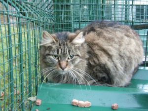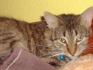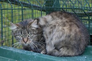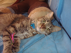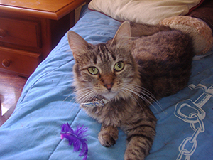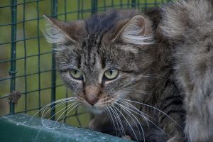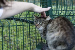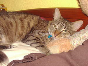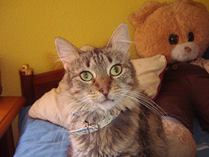 Si la encuentras atrincherada y vas con tiento, se deja acariciar, pero siempre vigilándote con desconfianza, se lleva bien con los otros gatos.