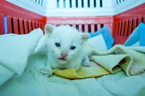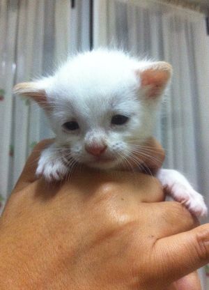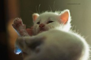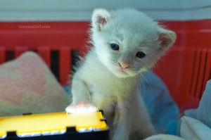 Fantasma, nombre en honor al huargo de Jon Snow en Juego de Tronos, es un pequeñín adorable. Es muy ronroneador. Peligrosamente achuchable, de los que te ponen las patitas en la cara… Aún no usa arenero, y estos días empieza a comer solito, pero poco a poco. Es blanquito menos la cola y la punta de la orejas que son marrones claritas, suponemos que tendrá mezcla de siamés.