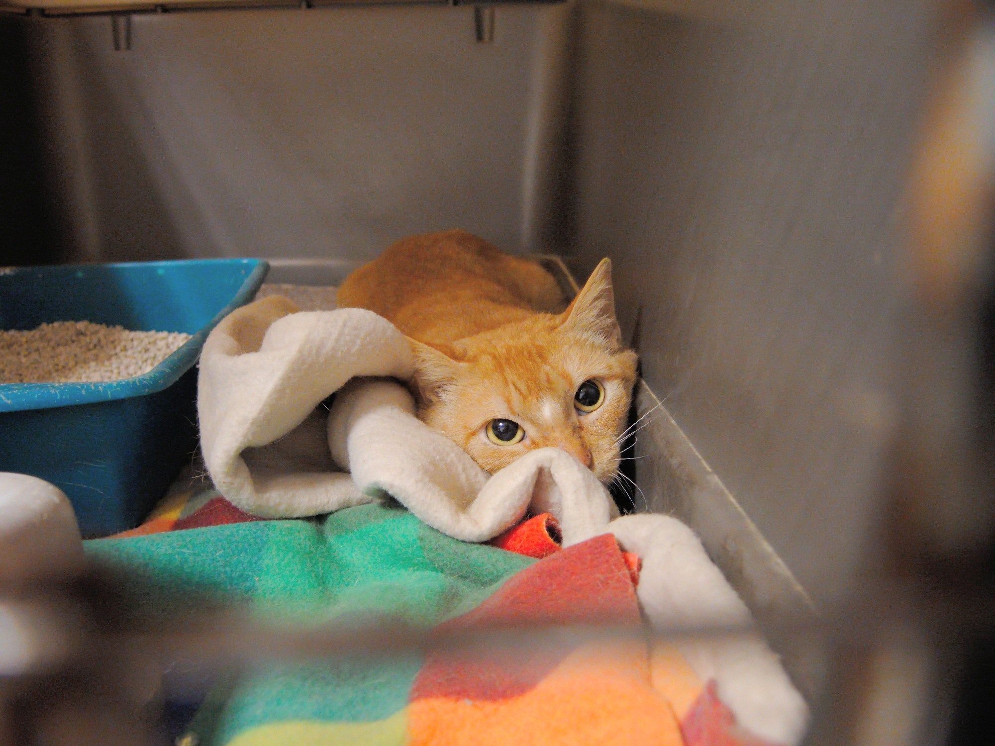 Farrell es un gato adulto que llegaba a nosotros este mismo mes tal como podéis ver en la primera foto. Es un gato que está muy asustado y que se muestra muy desoconfiado al hacerle su jaula.