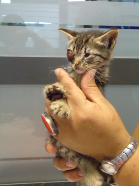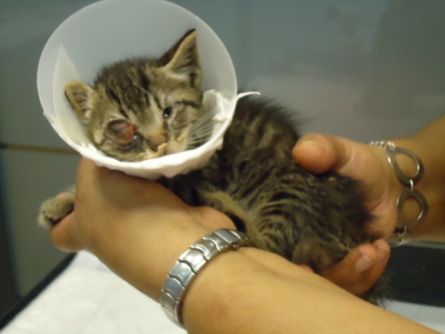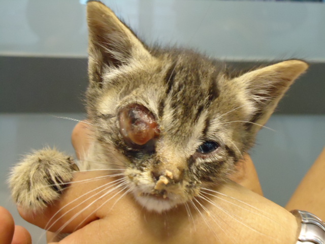 Recogido de la calle en estas lamentables condiciones: con un ojo completamente perdido y el otro cerrado. El veterinario le sacó todo el pus y afortunadamente, parece que ese sí se podrá salvar.