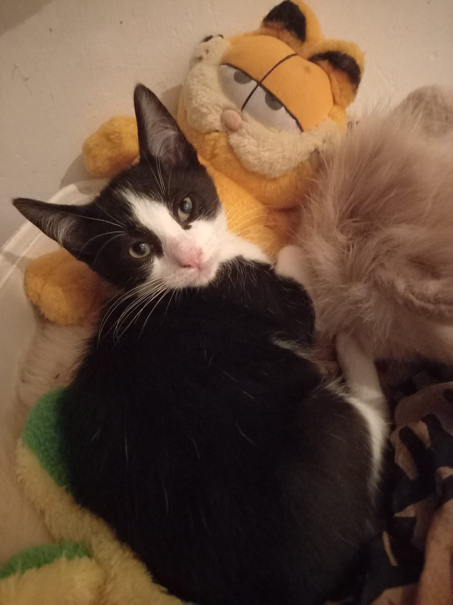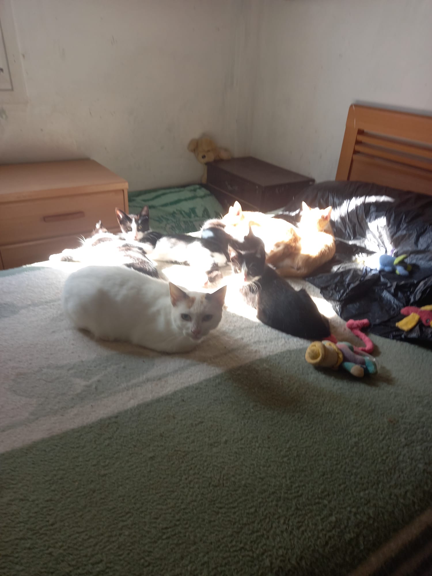 Hace un par de semanas una compañera nos pedía ayuda , habia rescatado de un solar abandonado una mami con 6 cachorros . Argi, la mama se muestra asustada y desconfiada pero cuida un monton a sus pequeños que son adorables! Varios miembros de esta familia (Argi, Brian, Euri) tenían abscesos de pus y Argi además una masa en una mama. Todos han recibido antibiótico y están estupendos. La madre dentro de poco podrá ser esterilizada y quitaran esa masa y los bebés ya están casi preparados para adopcion! La casa de acogida nos cuenta que son cariñosisimos y muy juguetones. Sería ideal que puedan ser adoptados de dos en dos o con familias que ya tengan gatos.