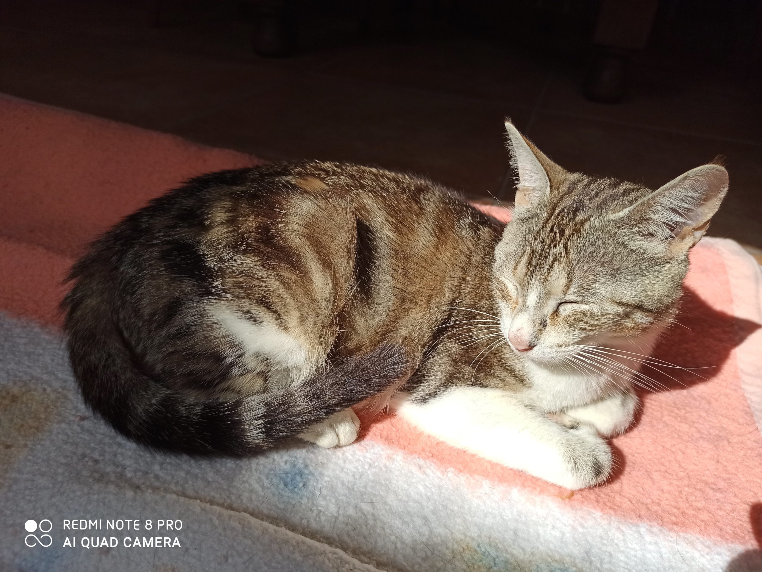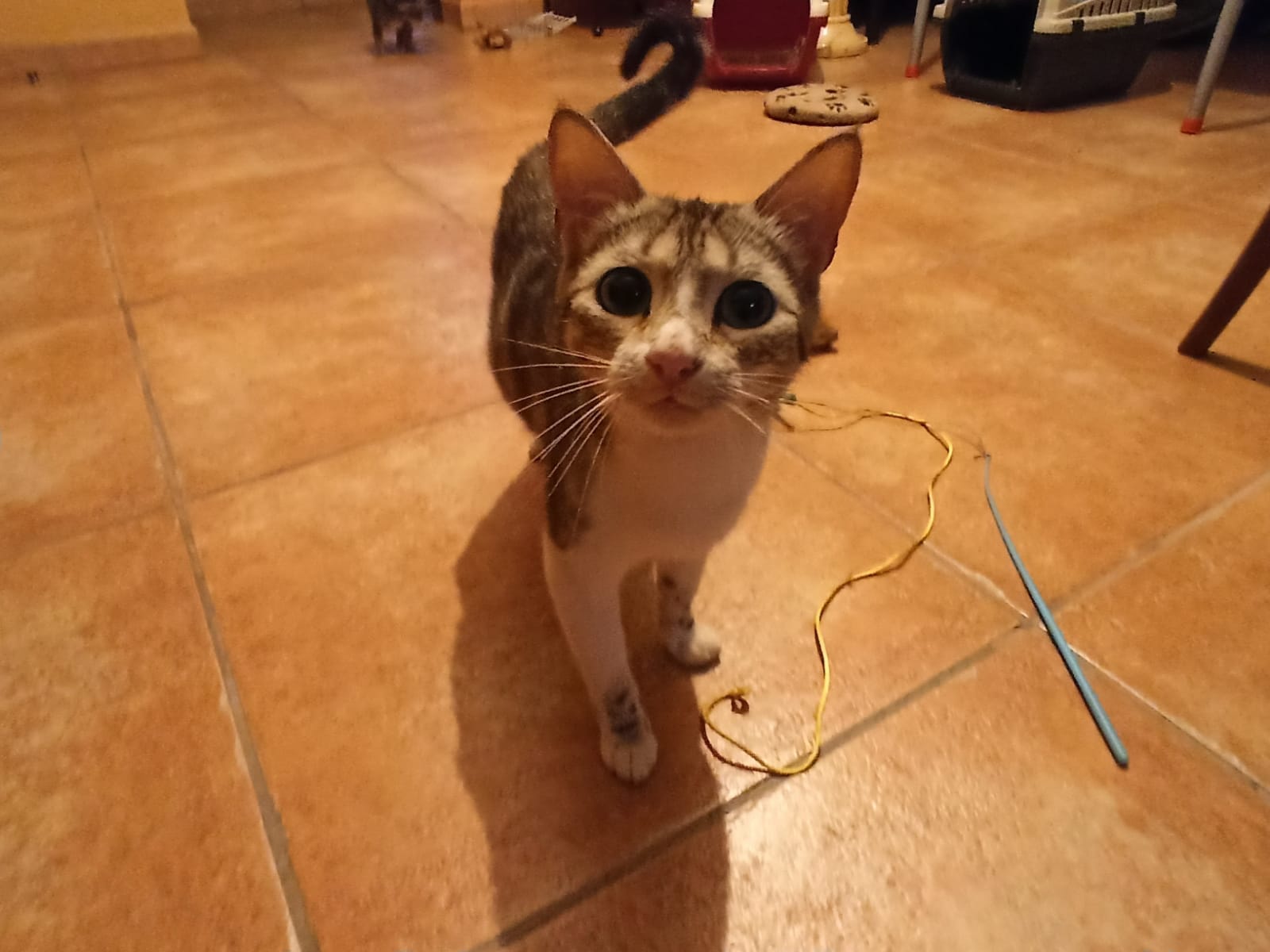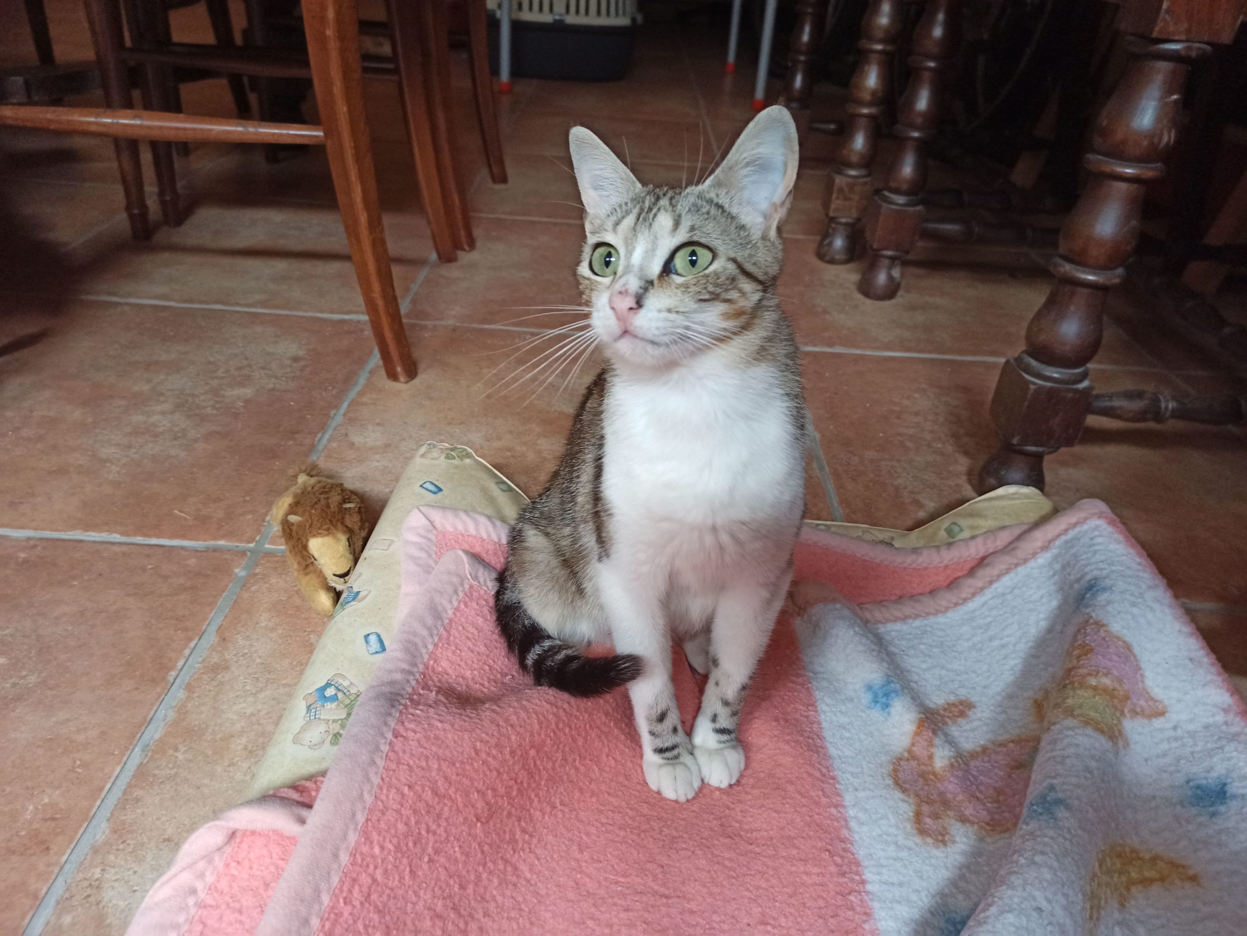 Es una gata muy cariñosa, tranquila y adorable. Por el momento, es de tamaño algo pequeño y no llega al año de edad, le calculamos unos 9 meses.