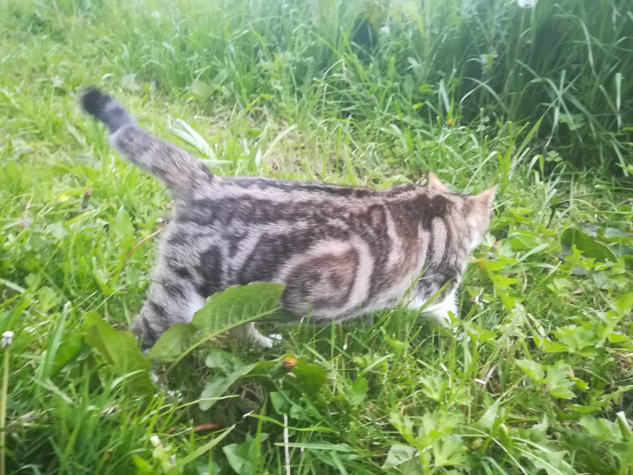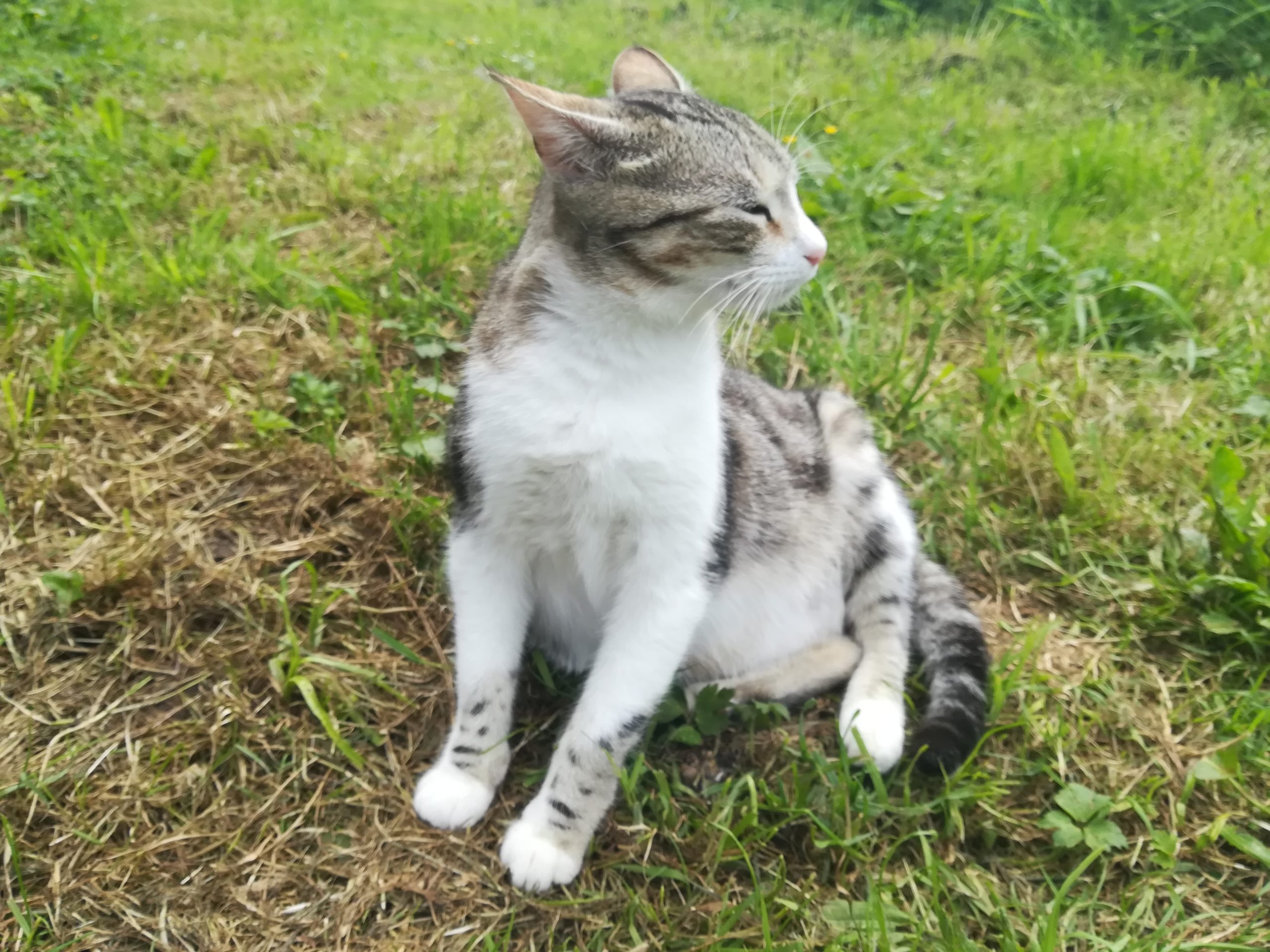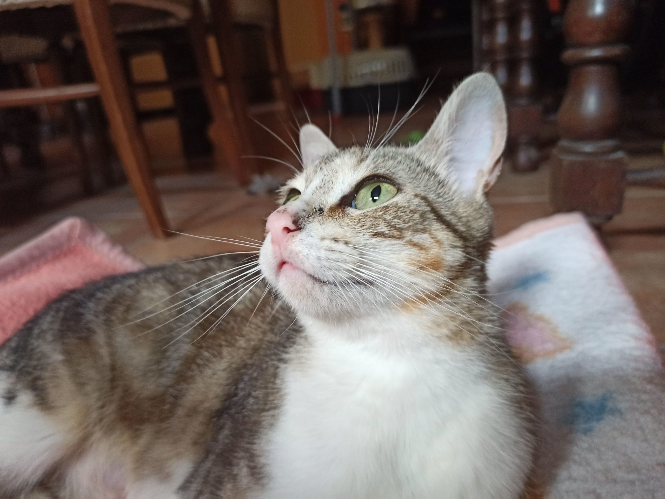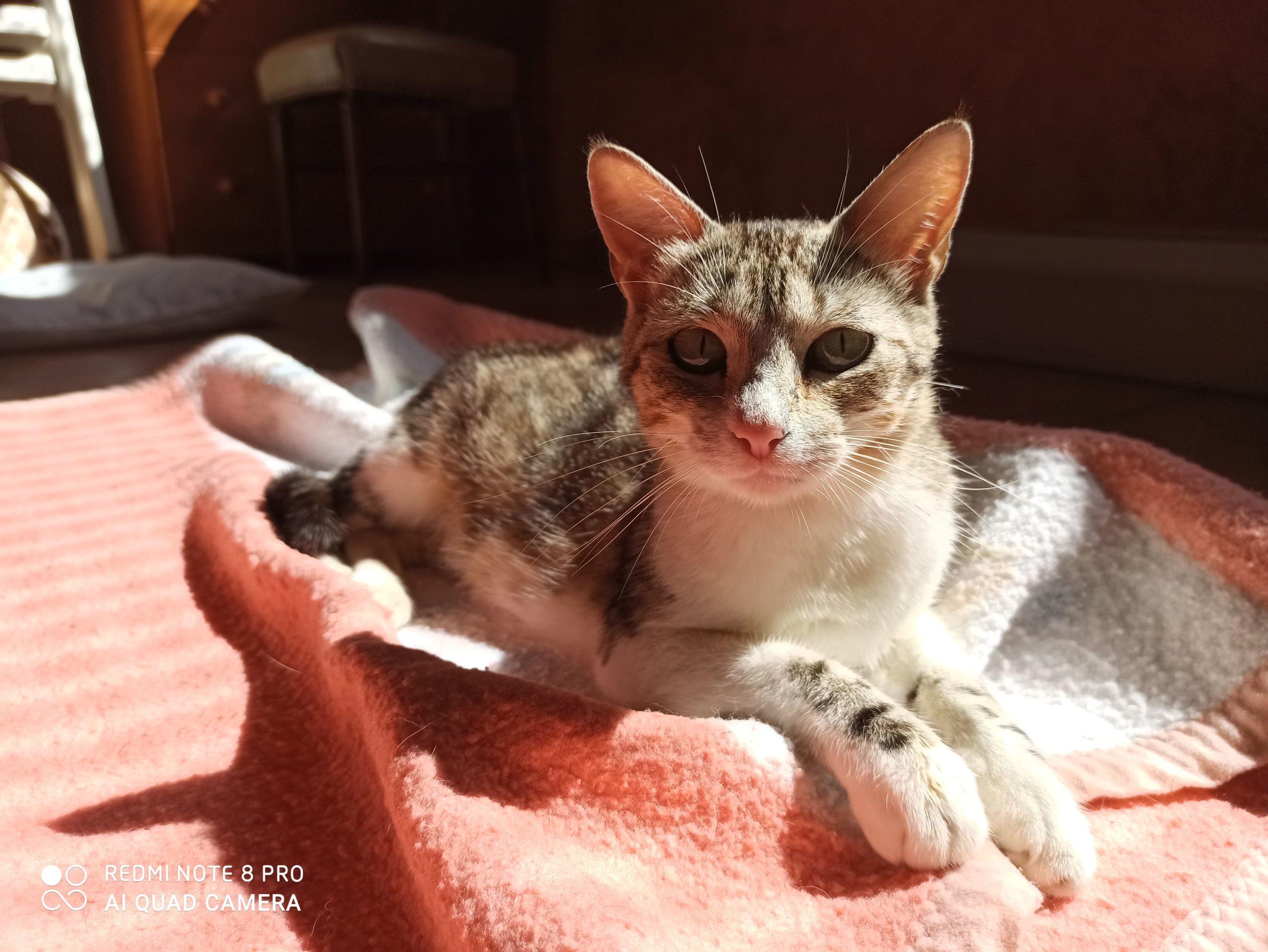 Es una gata muy cariñosa, tranquila y adorable. Por el momento, es de tamaño algo pequeño y no llega al año de edad, le calculamos unos 9 meses.