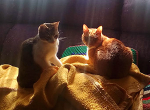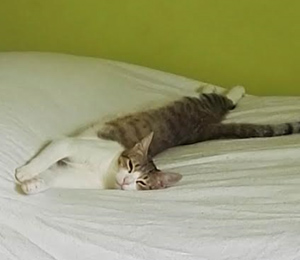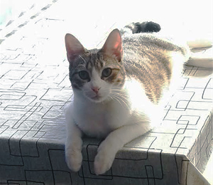 Es un gato estupendo que necesita aún tiempo para adaptarse. Cuando por lo que sea se asusta, se va a su camita que es donde se siente seguro. Ya no se esconde como al principio y está con nosotras en todo momento. Probablemente en unos días mas se dejará coger para recibir mimos. Se ve que es lo que necesita, muchos mimos y tener otro gatito con el que jugar y sentirse seguro.