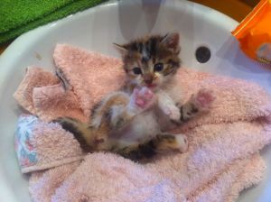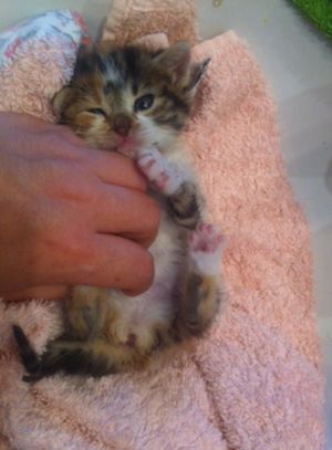 Cuando lo encontraron, pensaron que era un trozo de tubería, estaba desfallecido, se le caía la cabeza y no comía, pero dándole calor y con paciencia, y cariño, recuperó enseguida.