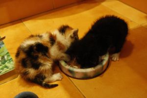 Son muy tragones, pero muy tragones y ronroneadores y te dan cabezazos para pedir mimos, bueno…mini cabezazos. Donde va uno, va otro. Son guapísimos y buscan familia.
