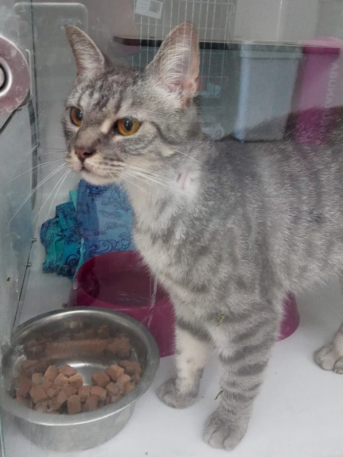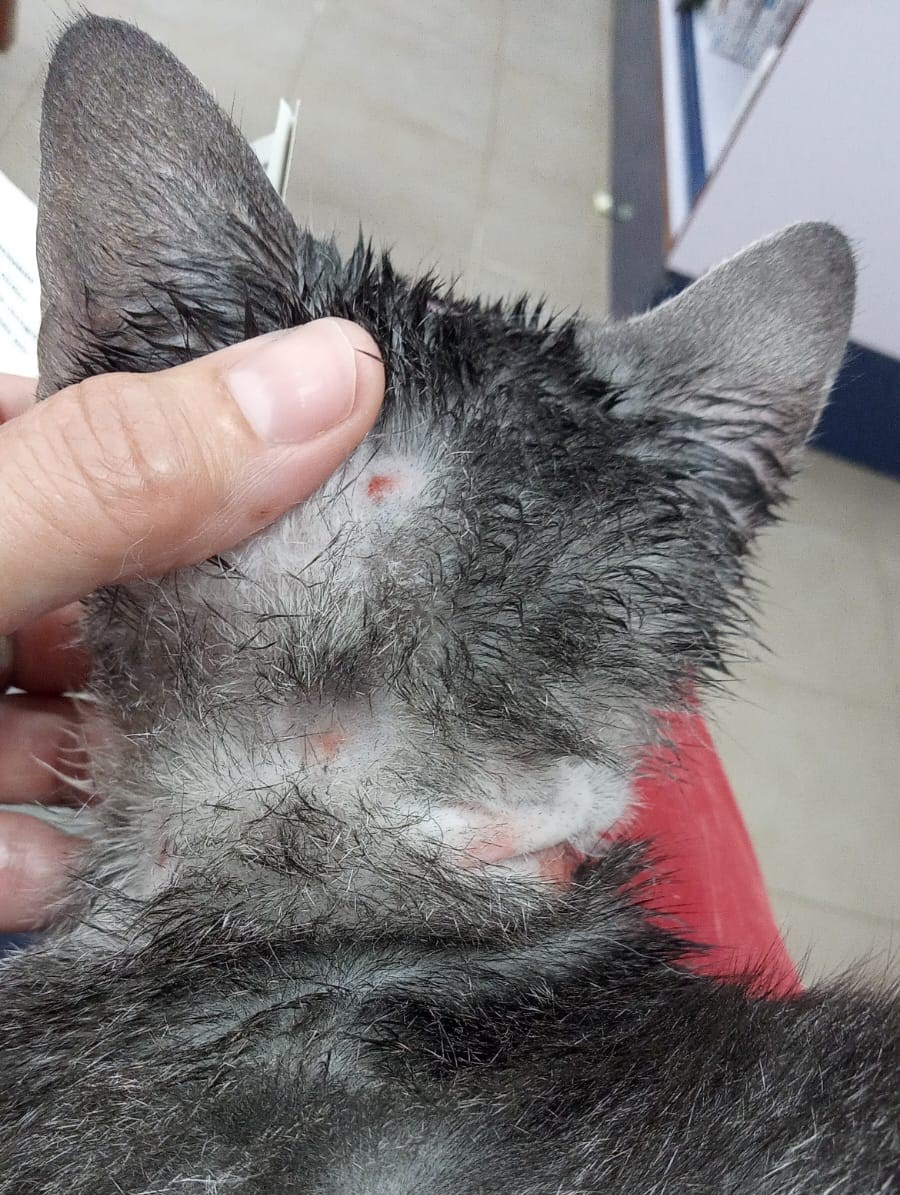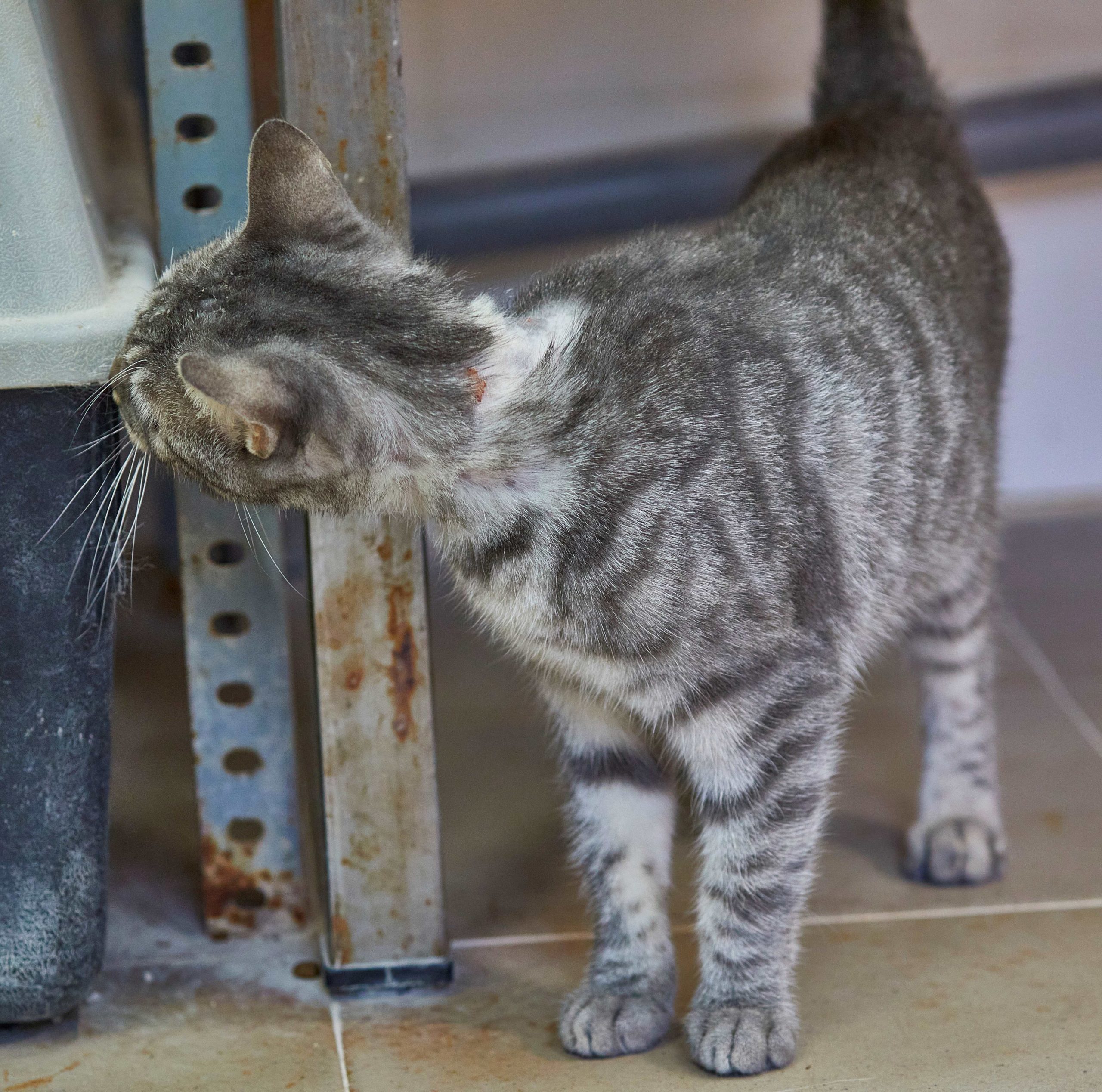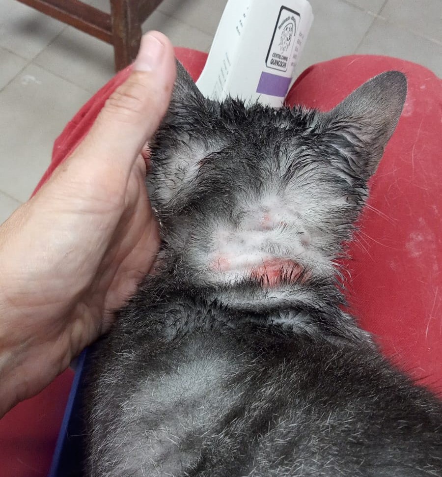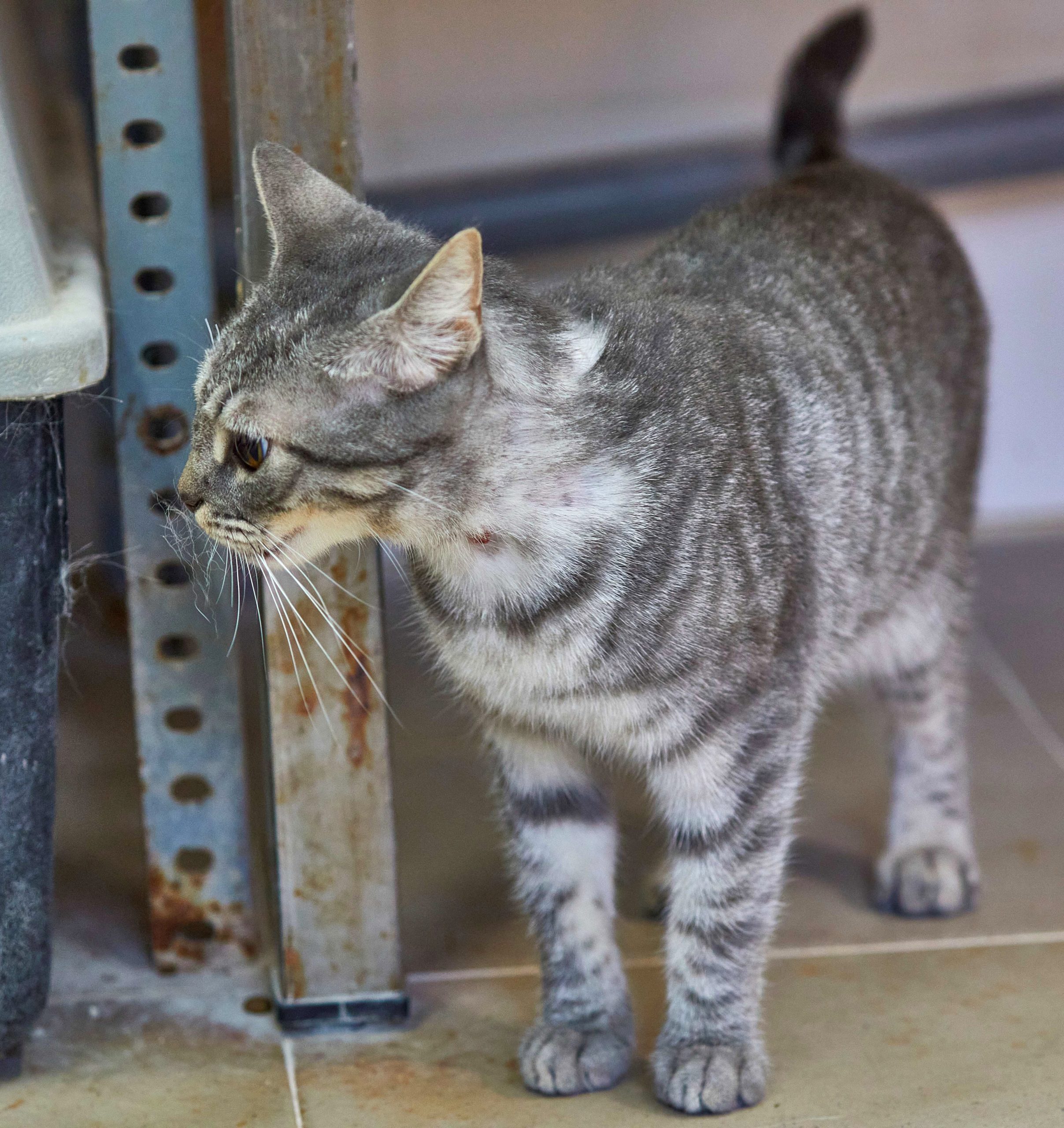 GRISA no llega al añito de edad. Es muy sociable y simpaticona con las personas. Nunca ha convivido con gatos pero no creemos que tenga problemas. Ahora mismo está en tratamiento por unas calvitas con las que llegó, pero ya está mucho mejor y empieza a tener pelito. Pronto se le dará el alta del hospital. 🙂