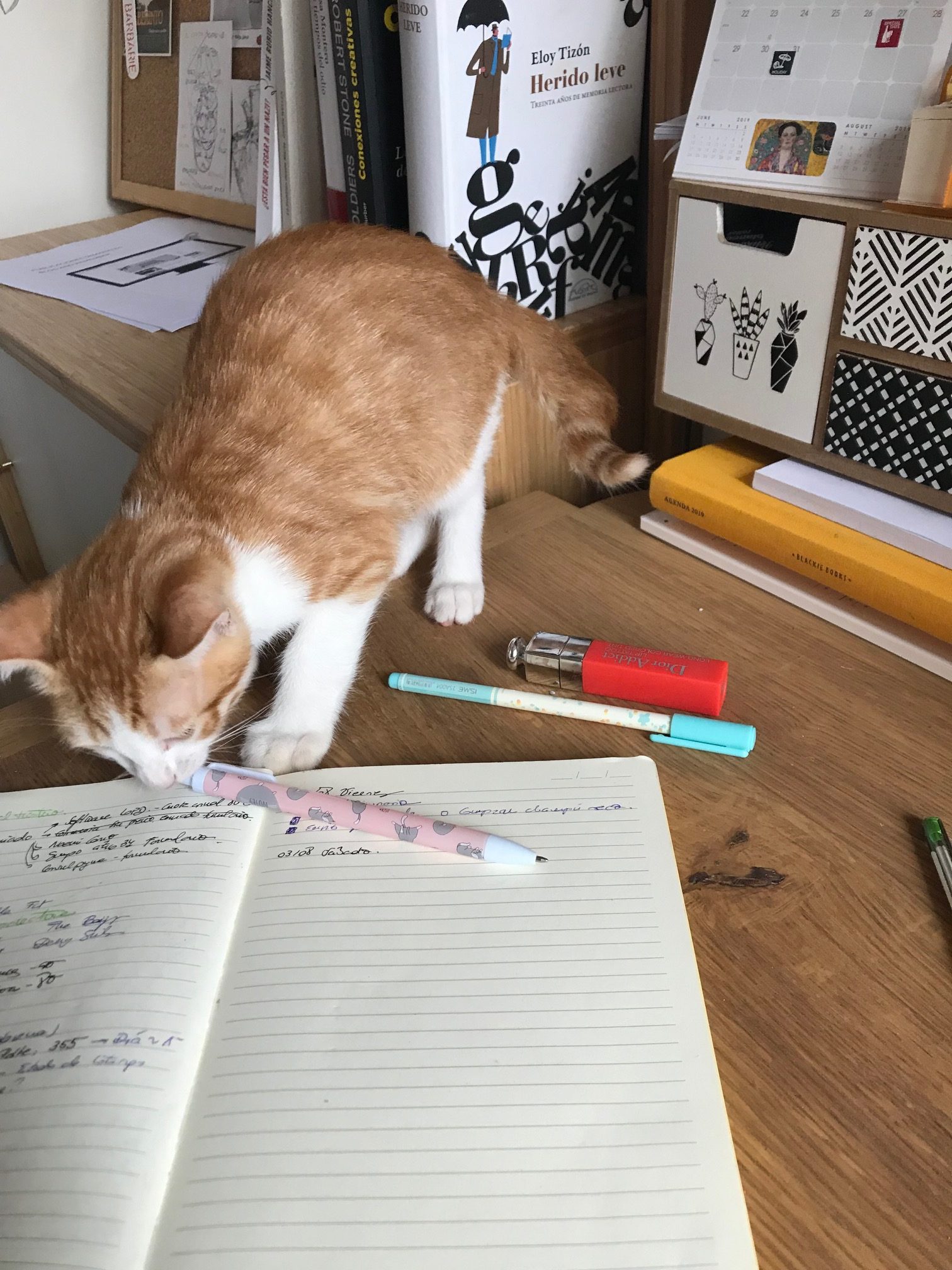 Ahora que se ha ido Ivette, se le nota un poco más tranquilo. No es un cachorro lleno de energía aunque sí que es curioso. Pero no se aleja demasiado; en cuanto se siente abandonado se pone a llorar y a soltar maullidos para que vayas a buscarle
